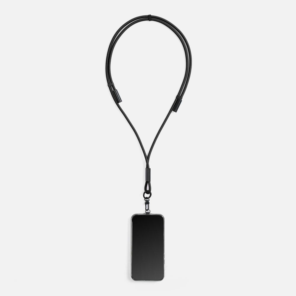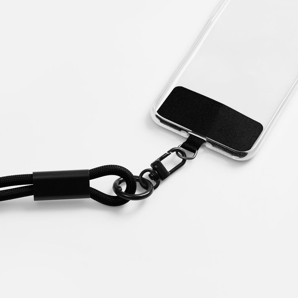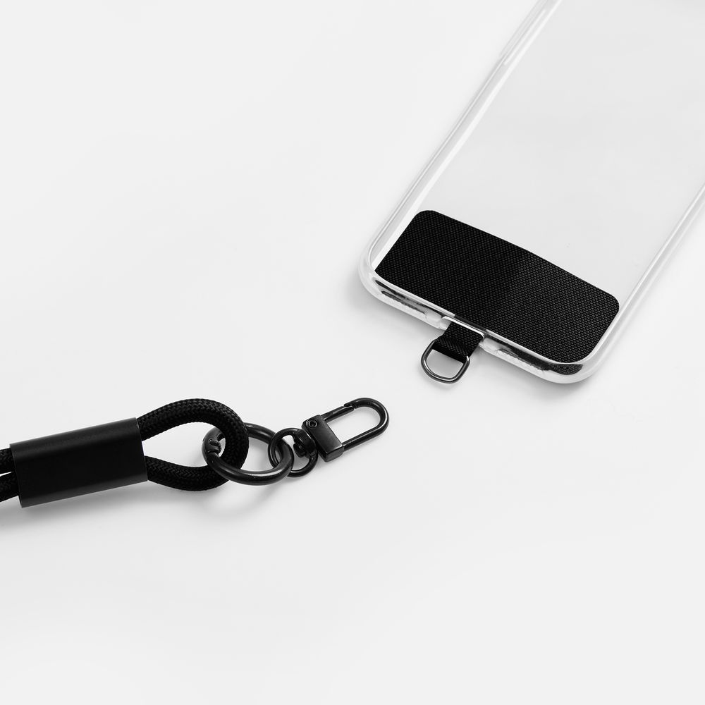 Важно: Для крепления телефона на ланьярд телефон должен иметь чехол. Если ланьярд распускается под тяжестью смартфона, убедитесь, что среднее из трех колец фурнитуры находится по центру ланьярда (на шее под затылком), а не сбоку. Соседние ветви оплетки должны идти вместе, без зазоров, так достигается трение ткани о ткань. Слишком тяжелые смартфоны (диагональ 6,9" и более) могут распускать ланьярд при энергичных движениях.