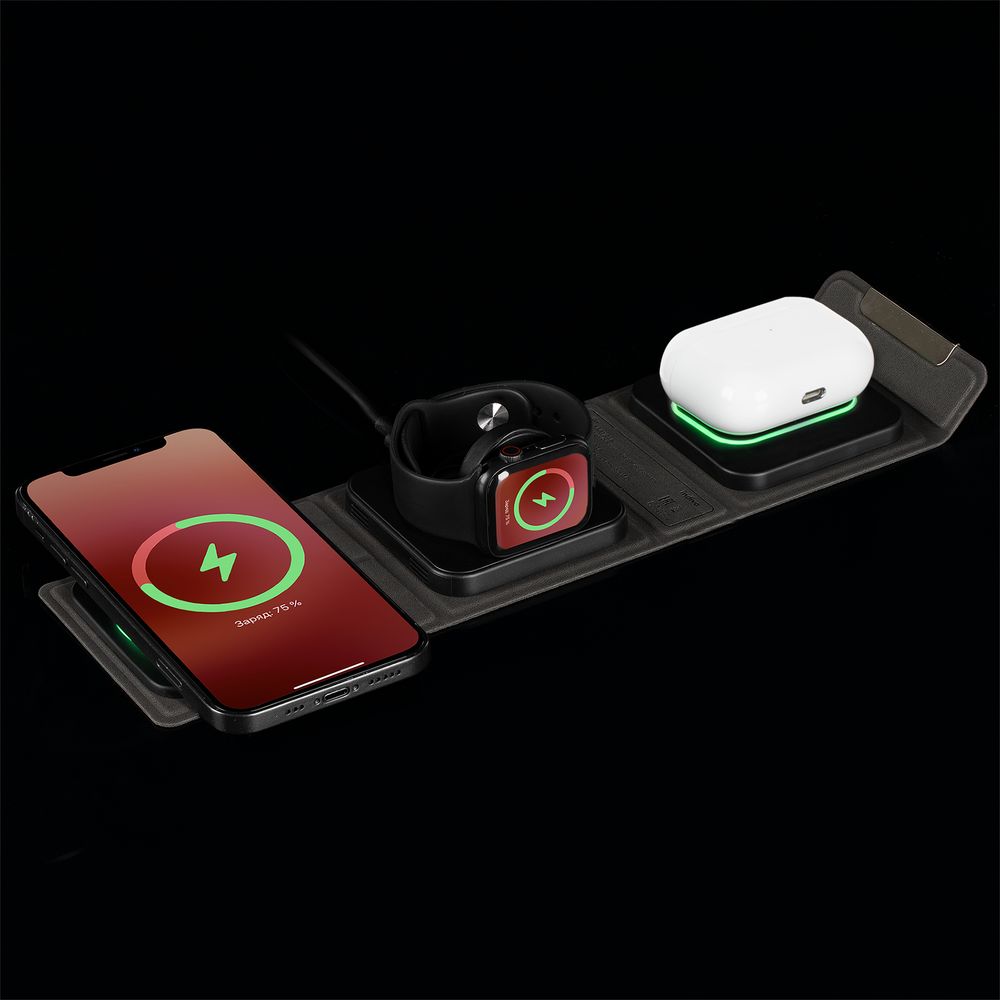 Зарядная станция совместима со всеми смартфонами, поддерживающими технологию беспроводной зарядки Qi. Также предусмотрено место для зарядки часов Apple Watch и наушников. Зарядка начнется автоматически при размещении устройств на индукционной площадке.