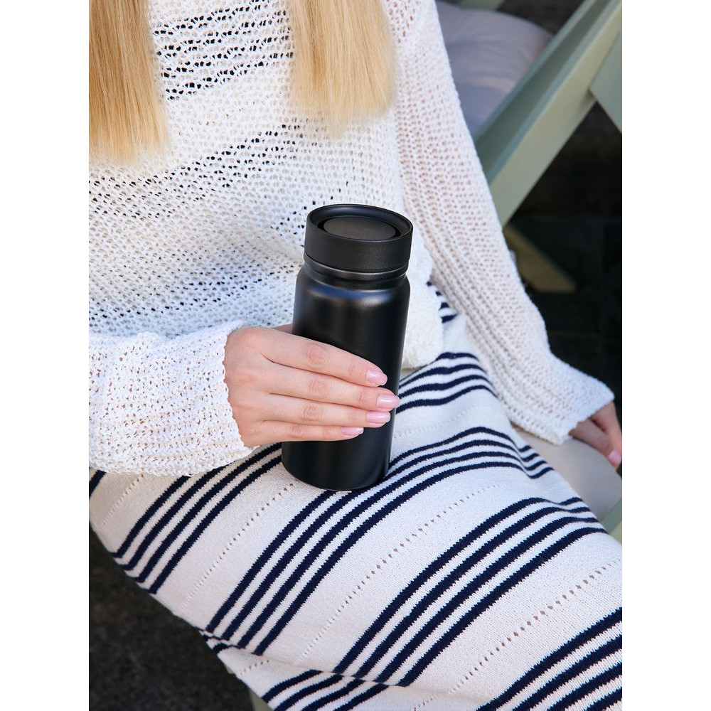 - Герметичная завинчивающаяся крышка с силиконовым уплотнителем и питьевой системой с клапаном — технология 360° позволяет одним нажатием открывать кружку и пить с любой стороны
