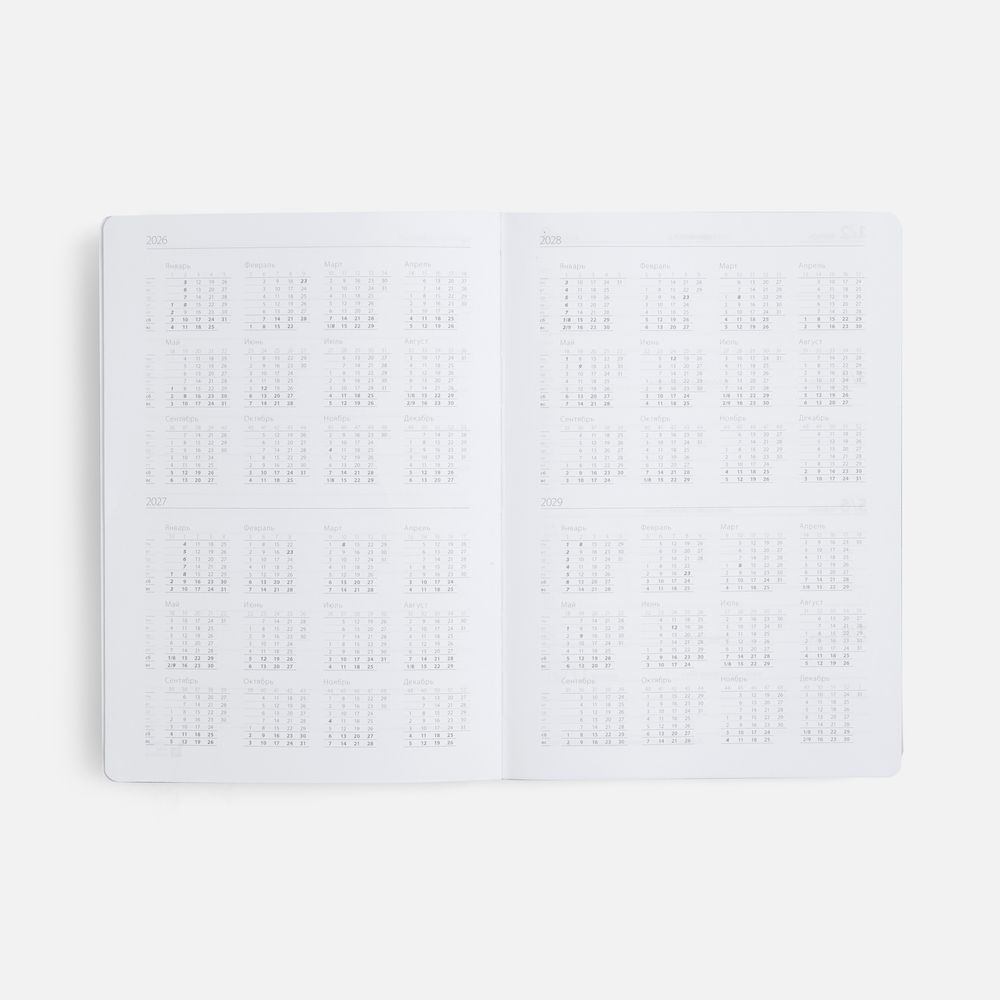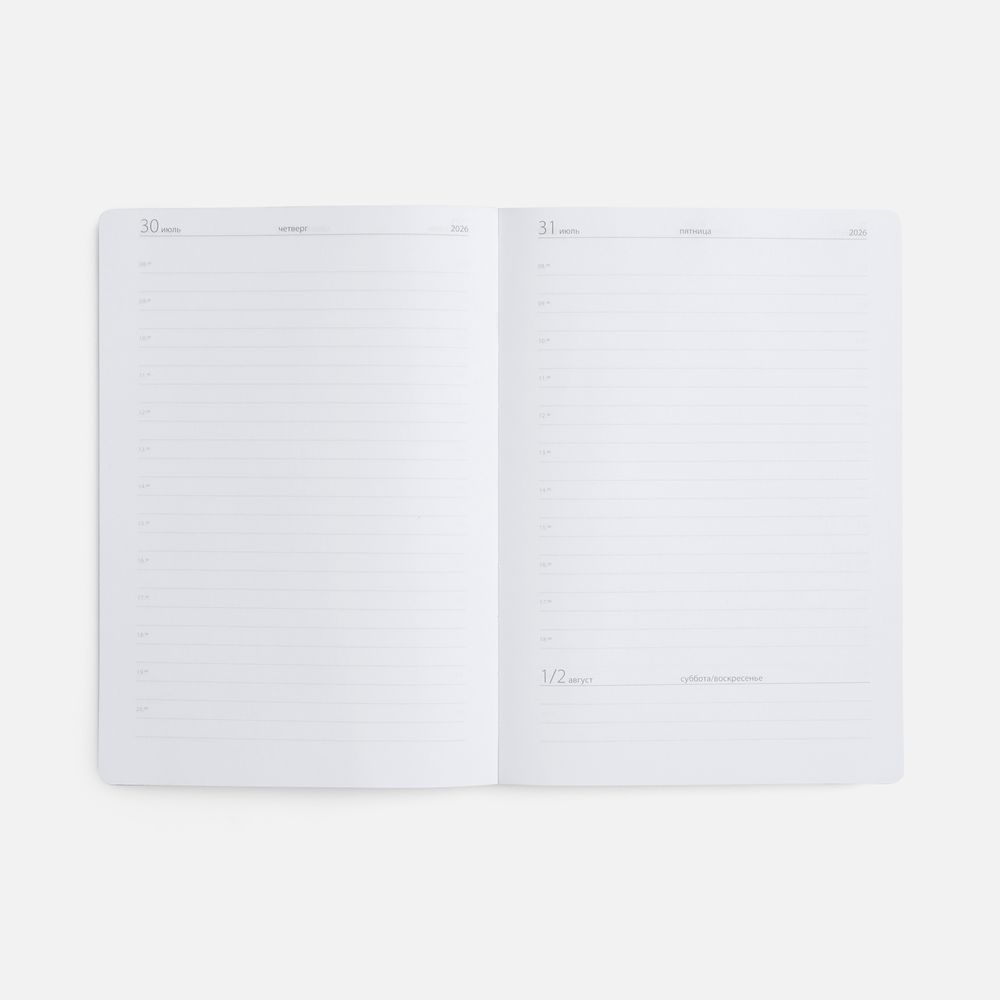 Ежедневник с полутвердой обложкой выполнен из материала Nice Touch, серый СС, и дополнен резинкой шириной 1 см с металлическим шильдом и ляссе серого цвета.