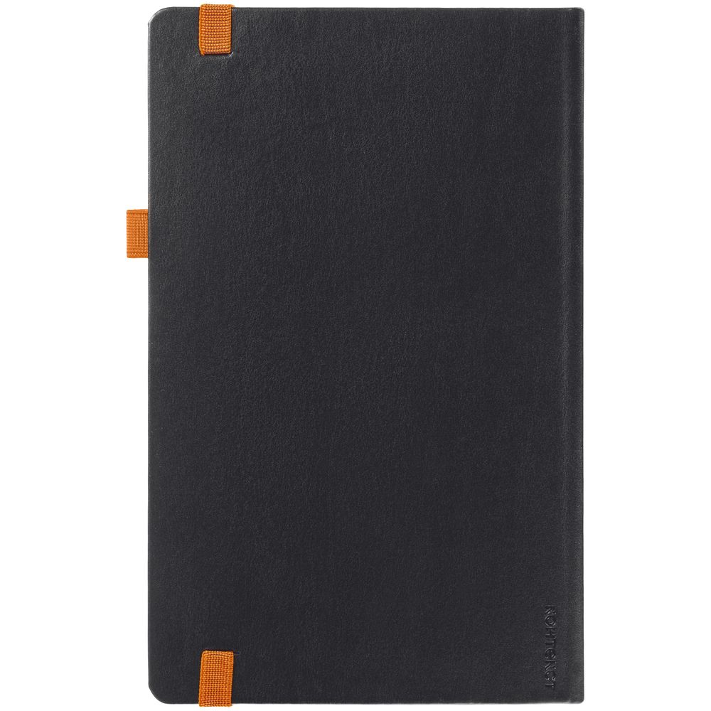 Ежедневник с твердой обложкой, выполнен из материала Waltz, черный АА, дополнен оранжевой резинкой и ляссе.