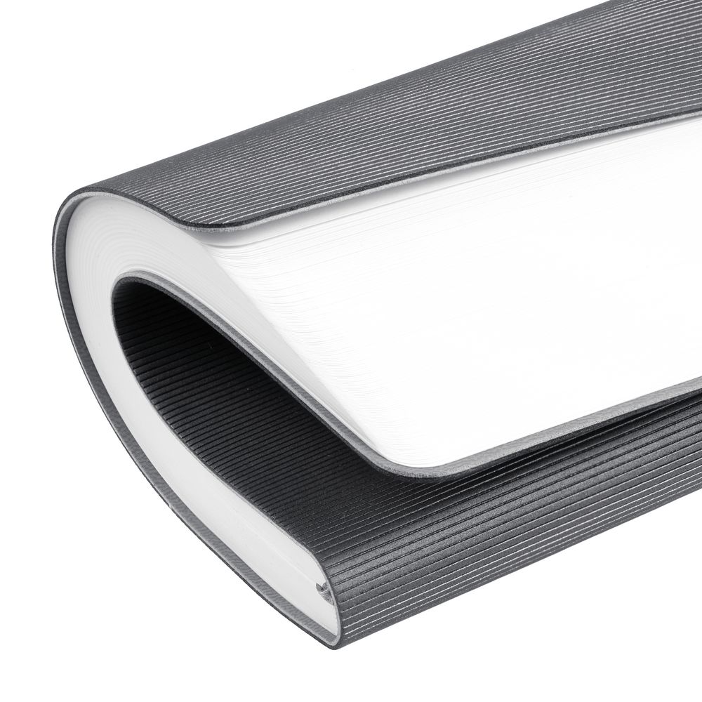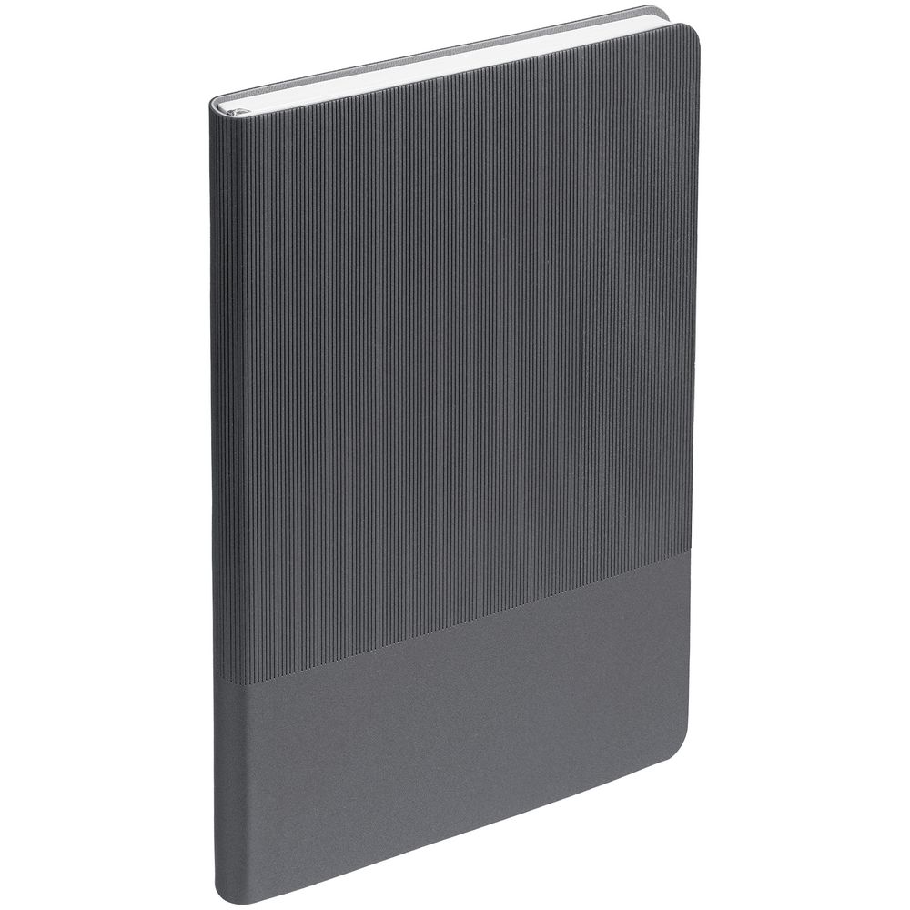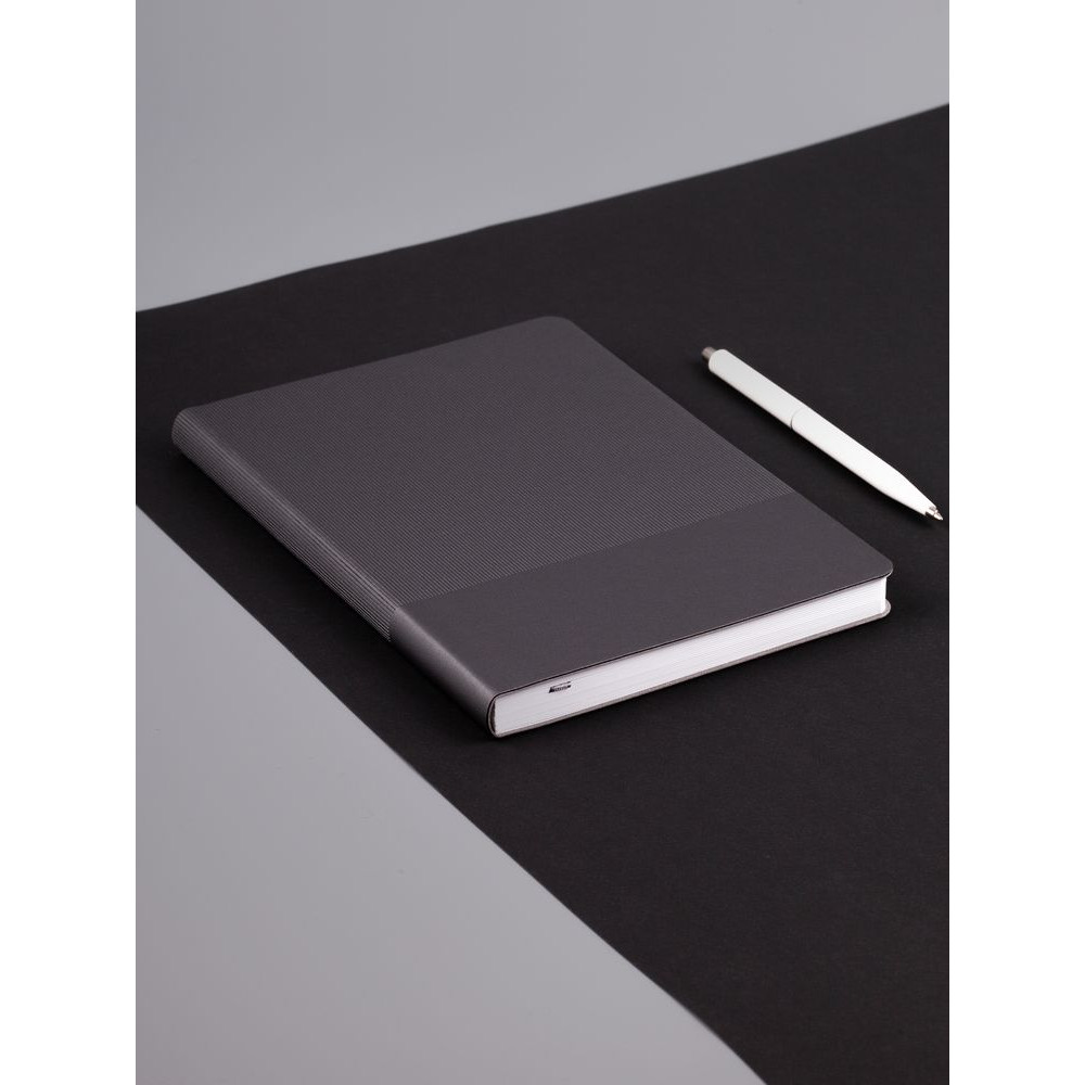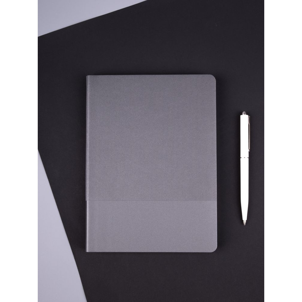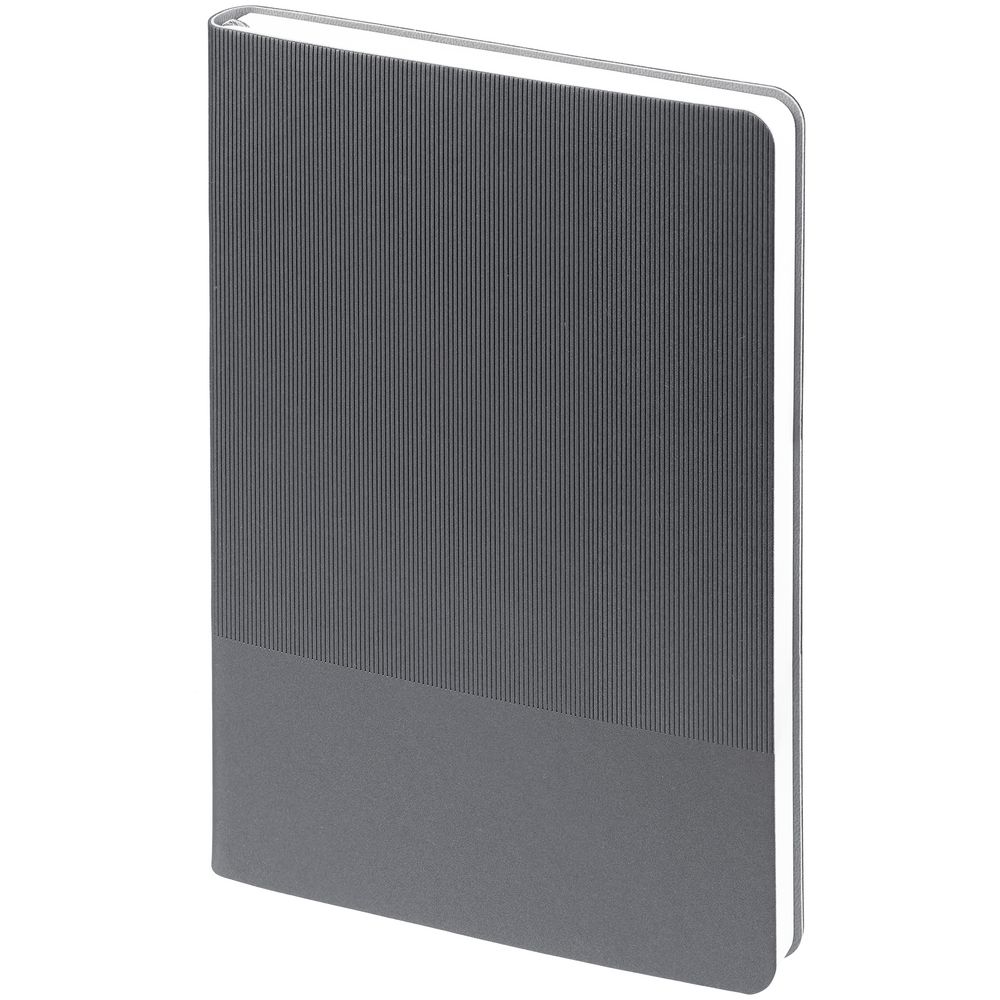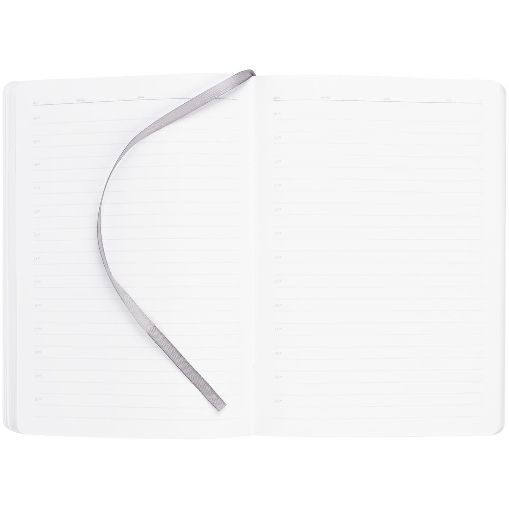 Ежедневник с гибкой обложкой выполнен из материала Soft Touch Perl, серый СС и Latte, серый (внутренний материал); дополнен ляссе серого цвета и фактурным тиснением обложки.