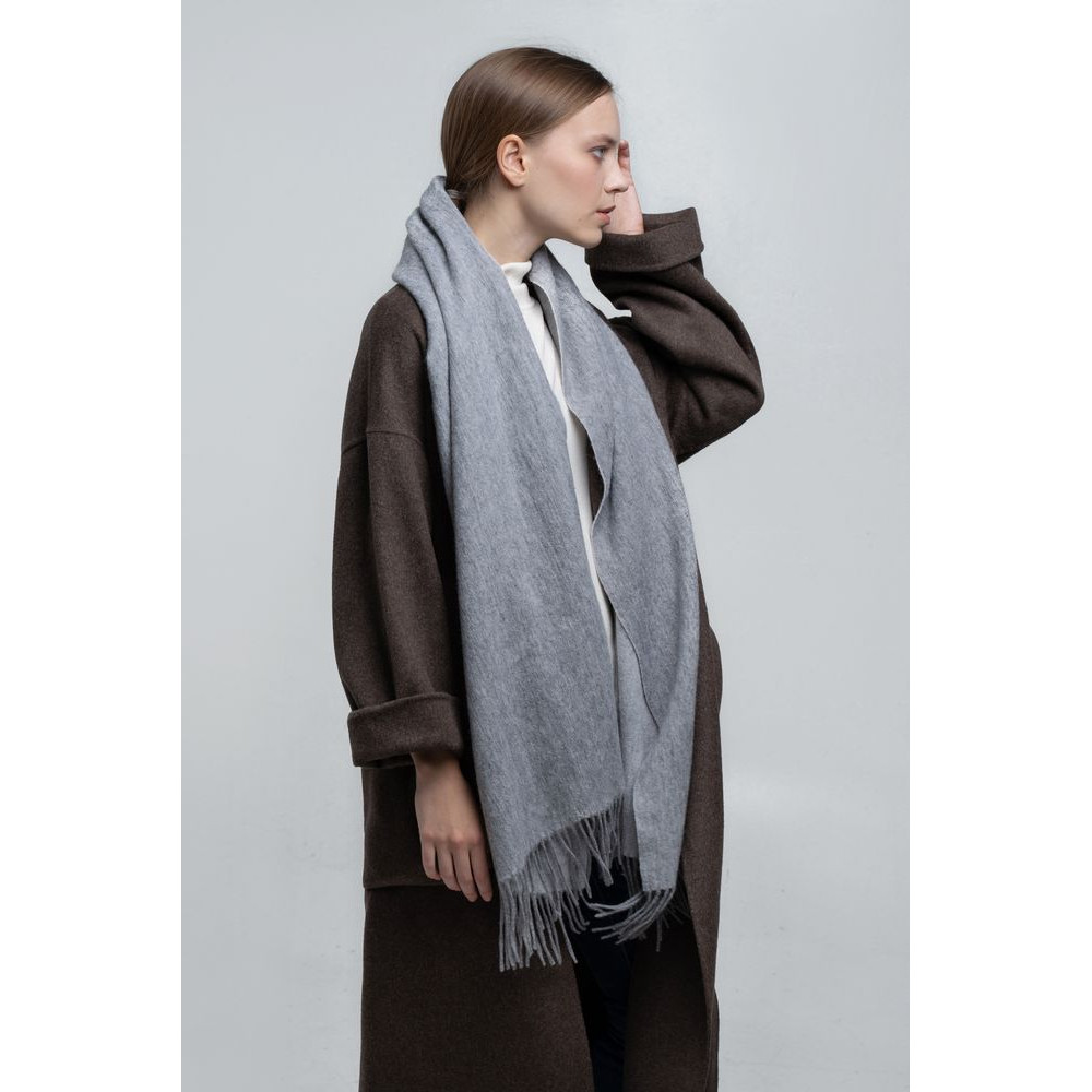 Широкий палантин с едва заметным узором плетения открывает простор фантазии — его можно использовать как шарф, головной убор или декоративный элемент для верхней одежды.