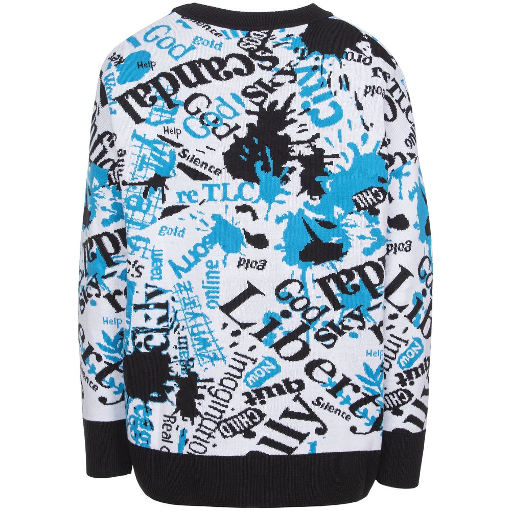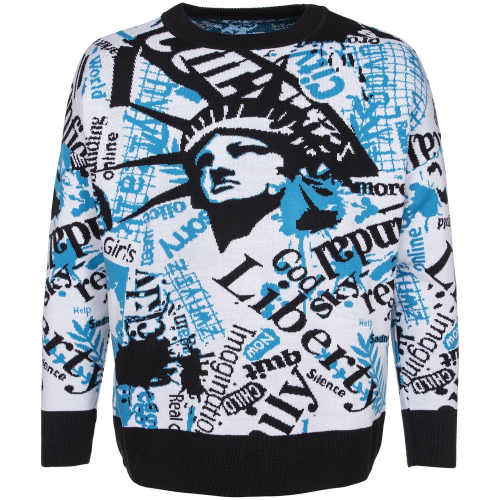 Свитер унисекс с вывязанным логотипом и индивидуальным рисунком в фирменной цветовой гамме.