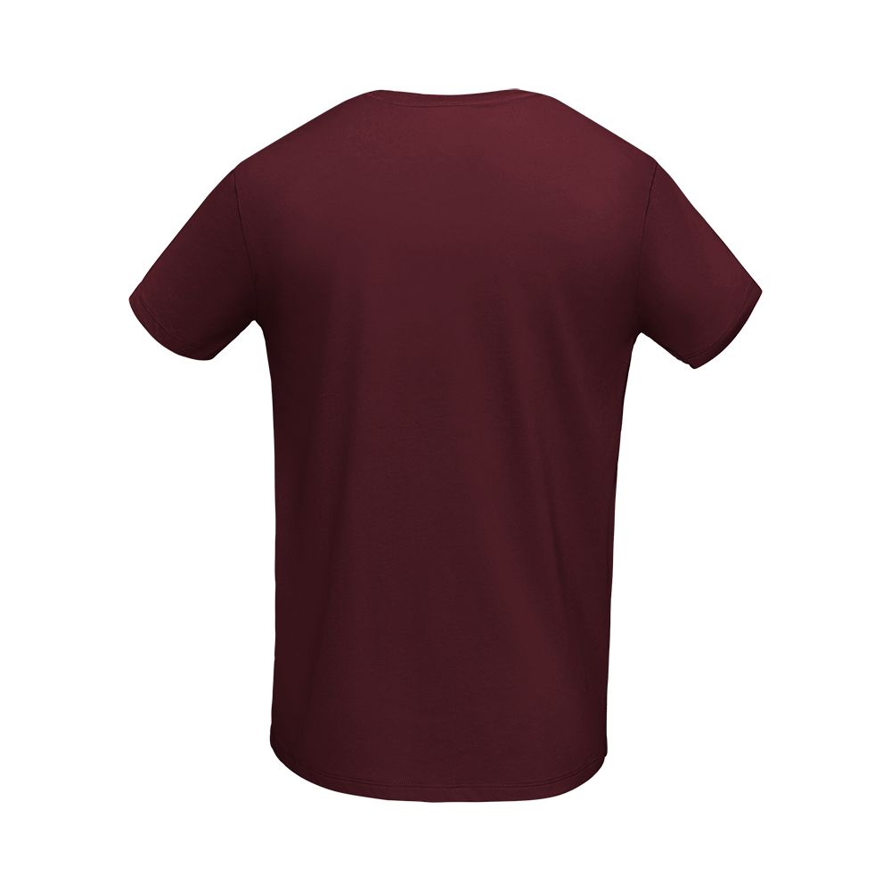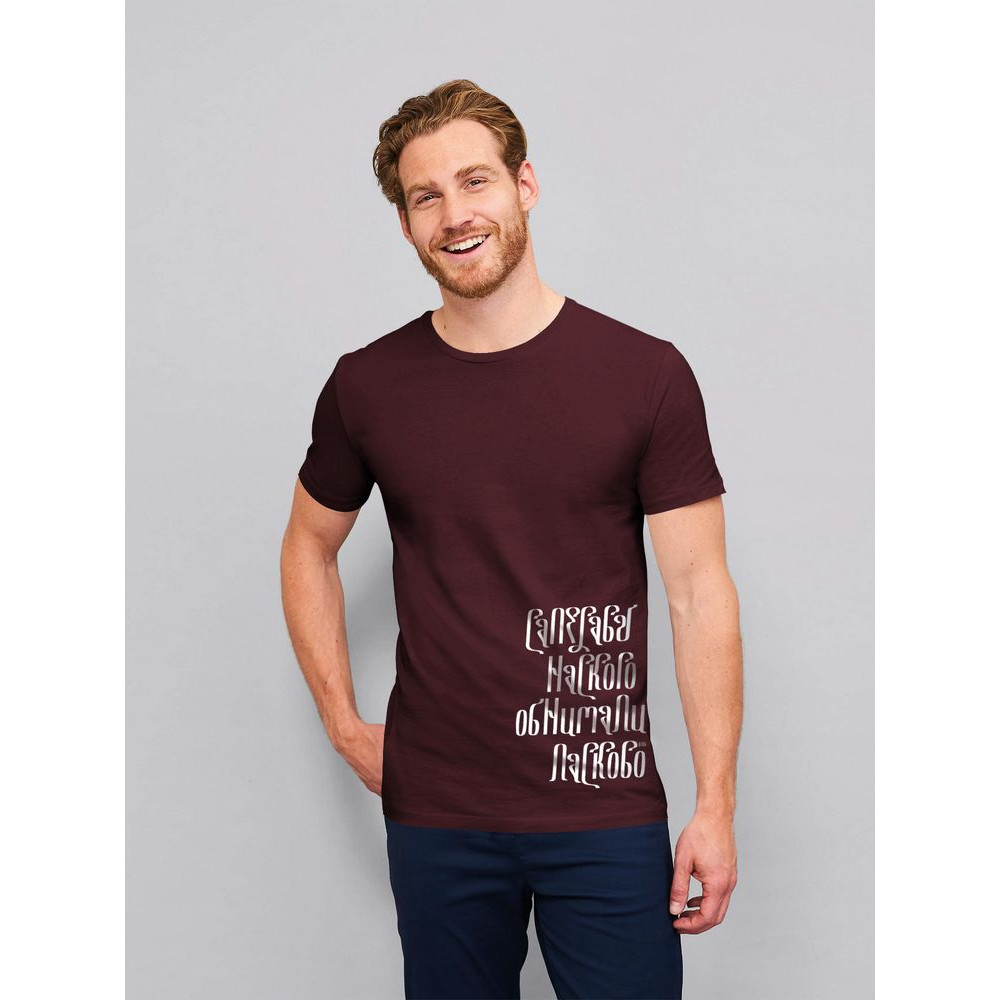 Футболка цвета бордо хорошо сочетается с пародией на бардовскую песню «Саперави наскоро, обнимались ласково...» Удачный выбор для пикника, похода в гости или прогулки с любимым человеком.Мужская облегающая футболка из джерси c боковыми швами и круглым вырезом.