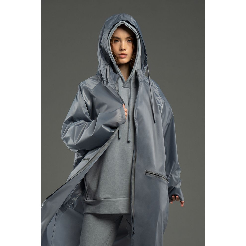 Плащ-дождевик на молнии с капюшоном из ткани таффета с полиуретановой пропиткой для защиты от сильного дождя.