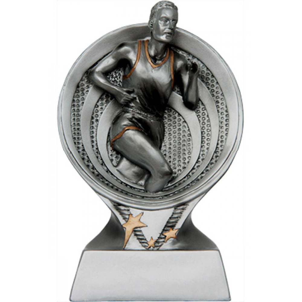 Фигурка литая "Бег". Материал пластик, цвет серебро. Высота 15,5 см.¶Фигурка представляет из себя круг, внутри которого изображены две окружности друг в друге, фон в виде частых мелких точек. В центре круга изображен бегущий спортсмен. В верхней части фигуры голова спортсмена выступает за область круга. Под кругом изображен элемент в форме треугольника с тремя звездами золотого цвета и вдавленным ребристым элементом в форме буквы "V". В нижней части фигуры, под треугольником, изображен цоколь в форме горизонтального четырехугольника. Место под эмблему 60 * 20 мм.
