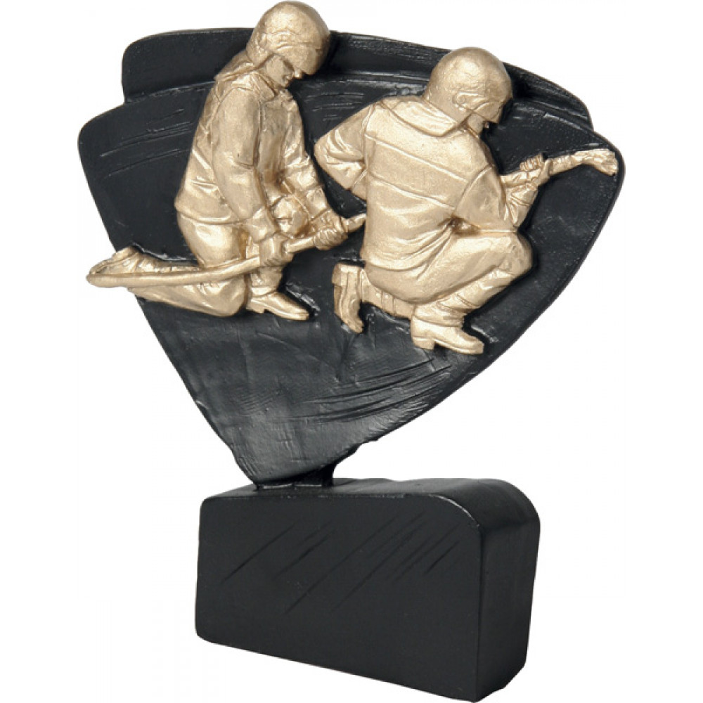 Фигурка литая "Пожарный". Цвет бронза. Высота 11 см. Представляет собой треугольник со скругленными углами и сторонами, установленный на черную прямоугольную подставку. По центру треугольника изображены два пожарных, сидящих на одном колене и держащих пожарный шланг.