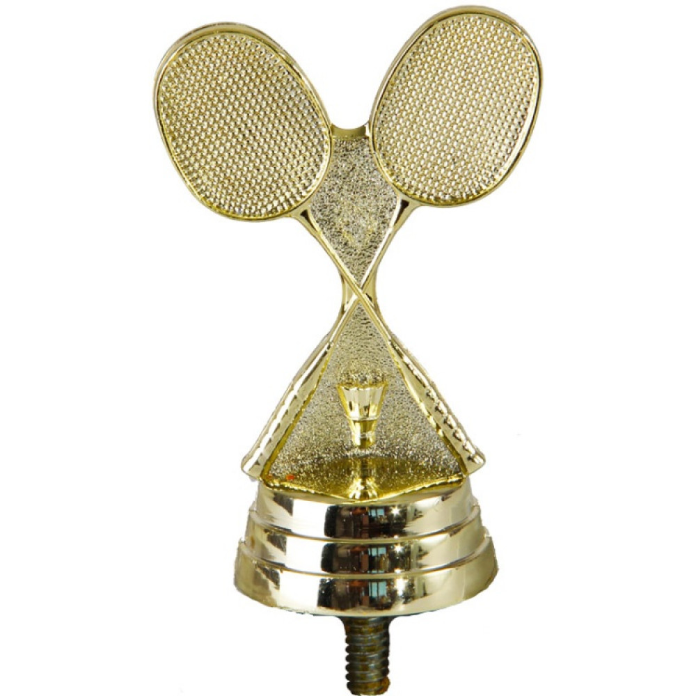 Цвет: золото, материал: пластик. Вид спорта: бадминтон. Фигурка выполнена в виде двух скрещенных в центре ракеток. Под ракетками, перьями вверх, расположился воланчик. Фигурка выполнена в золотом цвете, что придаёт ей роскоши и уникальности. Ниже - круглое основание, на котором имеются горизонтальные линии. Высота, см: 7.6 Вес, кг: 0.021. Фигурку возможно закрепить на цоколь, постамент или кубок.