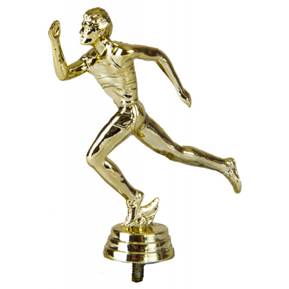 Цвет: золото, материал: пластик. Вид спорта: бег. Фигурка выполнена в виде фигуры мужчины-бегуна. Кажется, что он бежит дистанцию на соревнованиях. Его руки согнуты в локтях и расположены параллельно телу. Левая нога согнута в колене, правая находится в воздухе. Голова бегуна приподнята, взгляд направлен прямо на цель. Ниже - круглое основание, на котором имеются горизонтальные линии. Высота, см: 13 Вес, кг: 0.039. Фигурку возможно закрепить на цоколь, постамент или кубок.