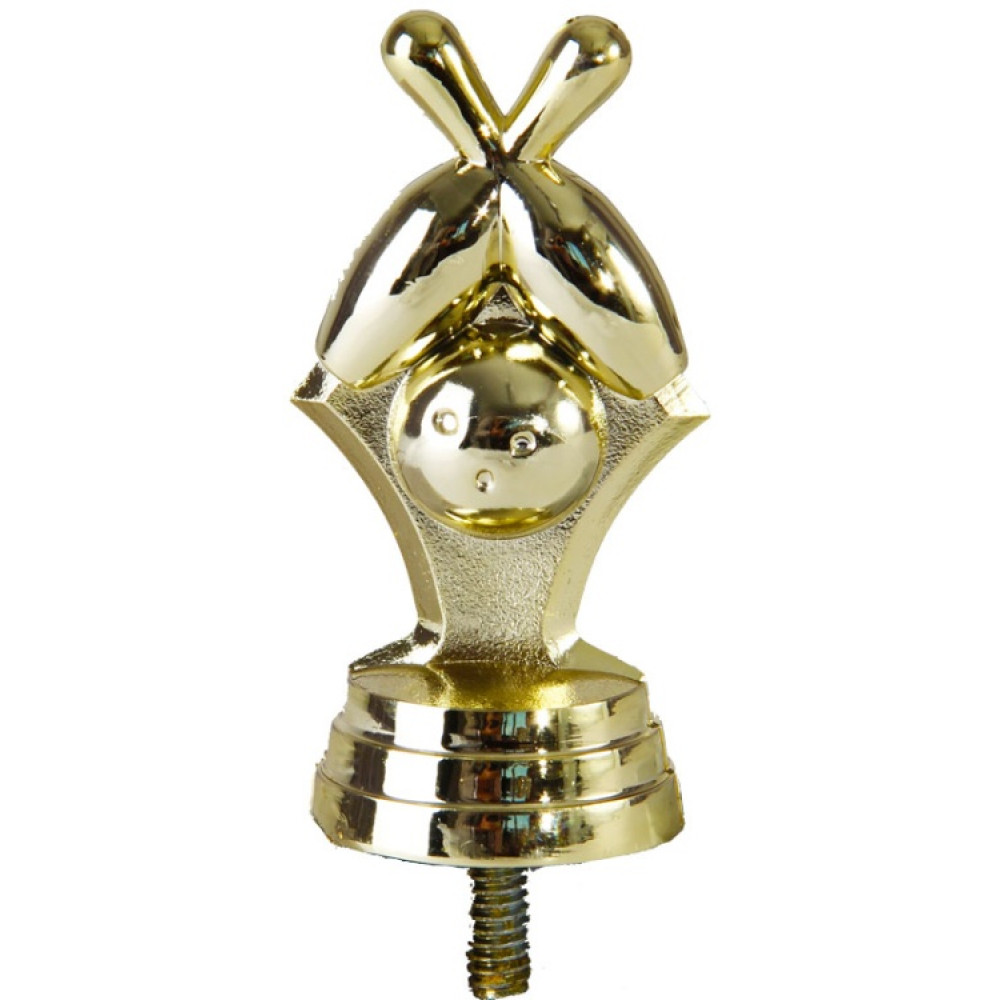 Цвет: золото, материал: пластик. Вид спорта: боулинг. Фигурка выполнена в виде перевернутого конуса со скошенными боками. В верхней части фигурка украшена двумя скрещенными кеглями и мячом для игры в боулинг. Фигурка выполнена в золотом цвете, что придаёт ей роскоши и уникальности. Ниже - круглое основание, на котором имеются горизонтальные линии. Высота, см: 7.6 Вес, кг: 0.025. Фигурку возможно закрепить на цоколь, постамент или кубок.