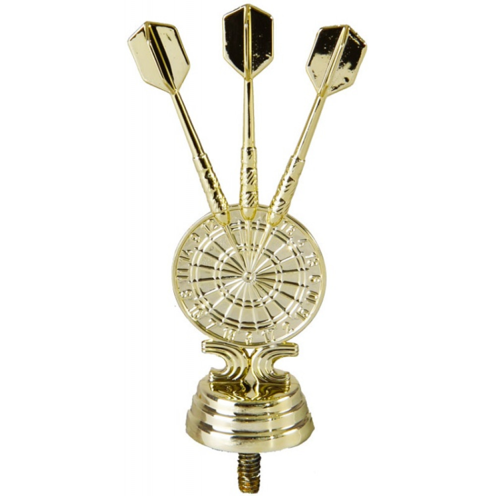 Цвет: золото, материал: пластик. Вид спорта: дартс. Фигурка выполнена в виде круглой мишени с нанесёнными на неё разметками для расчета баллов. Из круга выходят три дротика. Ниже - круглое основание, на котором имеются горизонтальные линии. Высота, см: 12.1 Вес, кг: 0.029 Фигурку возможно закрепить на цоколь, постамент или кубок.