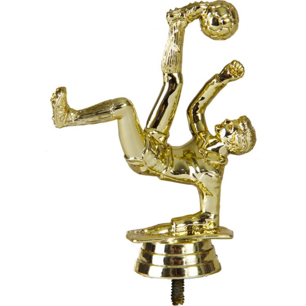 Цвет: золото, материал: пластик. Вид спорта: футбол. Фигурка выполнена в виде футболиста. Он удерживает свой вес на одной руке, согнутой в локте. Его левая рука поднята вверх с зажатым кулаком. Ощущение движения создаётся за счет необычного расположения ног спортсмена, которые зависли в воздухе. Носком кроссовка левой ноги он пинает мяч в воображаемые ворота. Ниже - круглое основание, на котором имеются горизонтальные линии. Высота, см: 12.1 Вес, кг: 0.033. Фигурку возможно закрепить на цоколь, постамент или кубок.