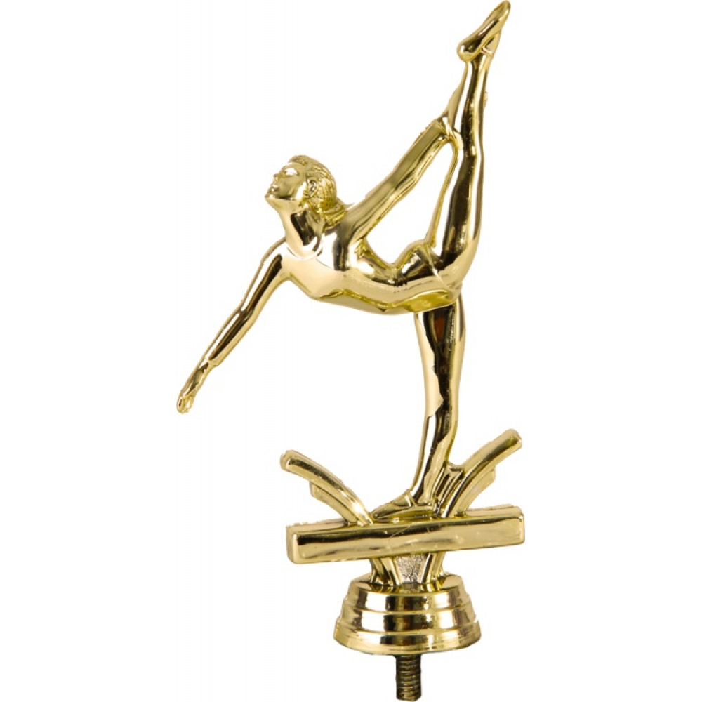 Цвет: золото, материал: пластик. Вид спорта: гимнастика. Фигурка выполнена в виде женщины-гимнастки. Её левая нога вытянута высоко вверх. Гимнастка удерживает равновесие на одной ноге. Голова поднята вверх, лева рука касается икры левой ноги. От ног спортсменки в разные стороны вверх отходят объёмные линии, которые прерываются широкой толстой прямоугольной пластинкой– имитацией спортивного снаряда. Ниже - круглое основание, на котором имеются горизонтальные линии. Высота, см: 15.9 Вес, кг: 0.042. Фигурку возможно закрепить на цоколь, постамент или кубок.