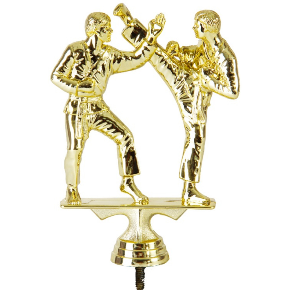 Материал пластик, цвет золото. Вид спорта: каратэ. Фигурка выполнена в виде двух мужчин, борющихся на ринге. Они выглядят сосредоточенно. Нога борца справа занесена вверх в ударе. Второй борец блокирует удар левой рукой. Ладонь раскрыта, пальцы правой руки сжаты в кулак. Одна нога борца справа выстелена вперёд на носок для поддержания равновесия, борец слева удерживается равновесие на одной ноге. Обе его руки согнуты в локтях, руки сжаты в кулаки. Оба игрока одеты в кимоно, подпоясанные поясами, и штаны. Каратисты находятся на тонкой дощечке – миниатюре ринга для боя. В нижней части фигуры – основание в виде конуса, на котором имеются горизонтальные линии. Высота фигурки, см: 15.9