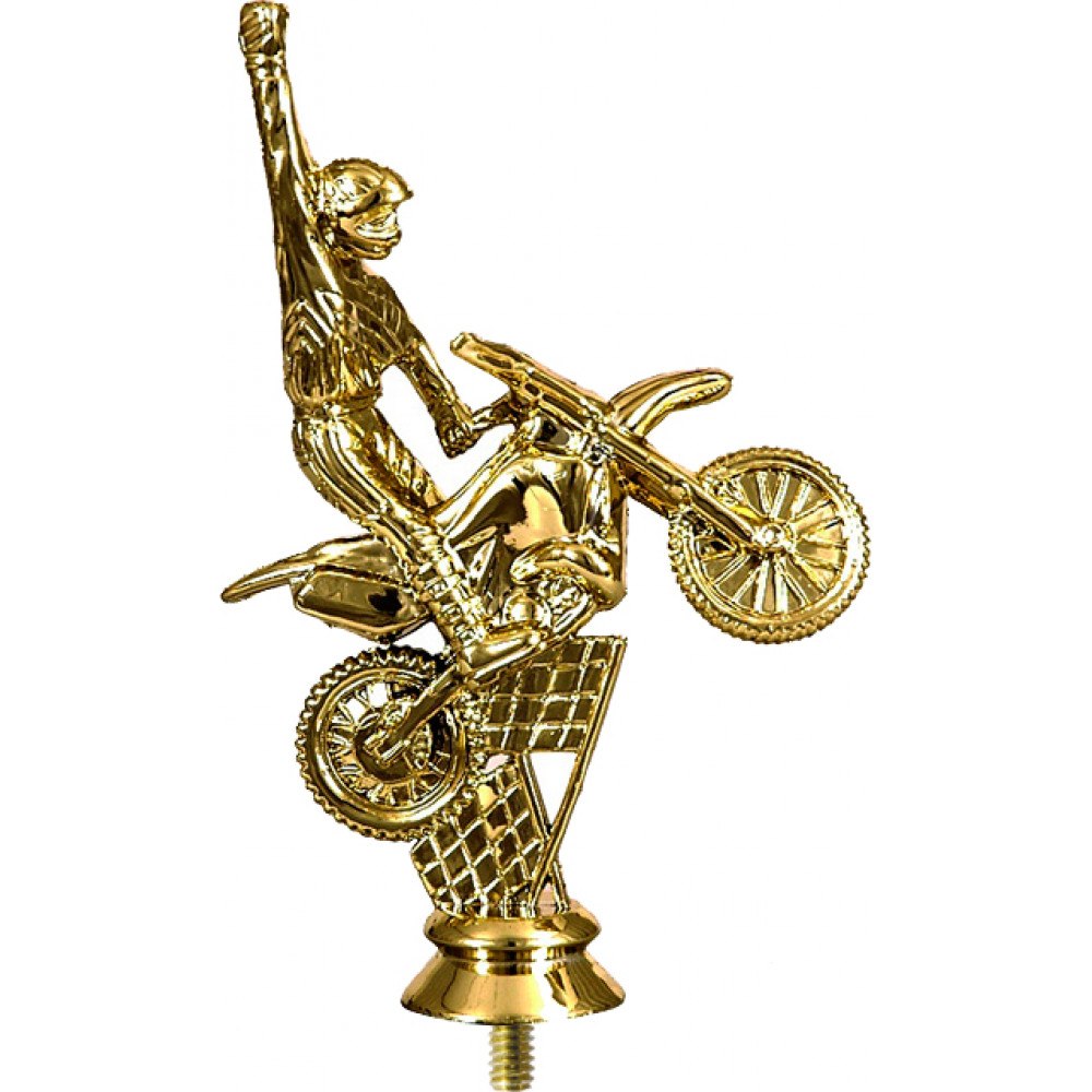 Фигурка пластиковая "Мотоспорт". Цвет золото. Высота 12 см. Представляет из себя спортсмена на мотоцикле, который пересек финишную черту первым. Переднее колесо мотоцикла приподнято вверх. Мотоциклист стоит на мотоцикле, ноги прямые, левой рукой держится за руль, правая рука поднята вверх, кулак сжат. Мотоциклист в соответствующей спортивной форме и шлеме. Мотоцикл установлен на двух финишных флагах. Флаги имеют клетчатый выпуклый орнамент.¶Фигурка установлена на стеме в виде небольшого элемента конусообразной формы. Фигурку возможно закрепить на цоколь, постамент или кубок.