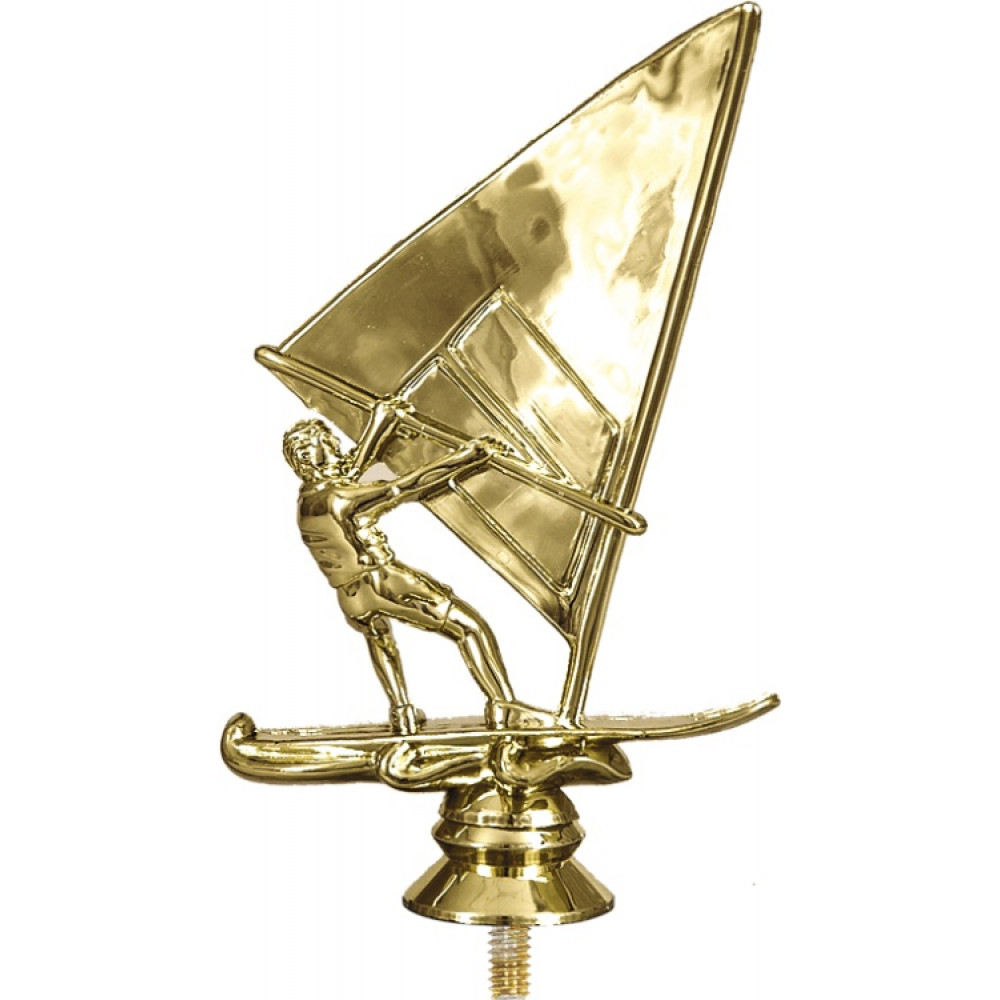 Фигурка пластиковая "Парусный спорт". Цвет золото. Высота 14 см. Изображен спортсмен, который держится руками за парусник, корпус тела отклонен немного назад. Под парусом изображены три закрученные волны.¶Фигурка установлена на стеме в виде небольшого элемента конусообразной формы. Фигурку возможно закрепить на цоколь, постамент или кубок.