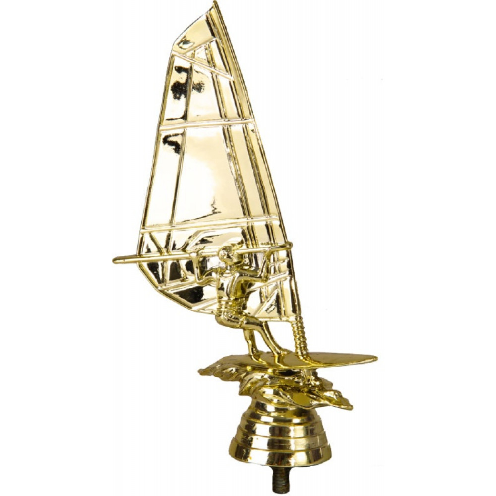 Цвет: золото, материал: пластик. Вид спорта: парусный спорт. Фигурка выполнена в виде спортсмена, соревнующегося на яхте. Парус развевается на ветру. Спортсмен согнул ноги в коленях для удержания равновесия. Парус переливается на свету. Под яхтой плещутся волны. Ниже - круглое основание, на котором имеются горизонтальные линии. Высота, см: 15.9 Вес, кг: 0.044. Фигурку возможно закрепить на цоколь, постамент или кубок.