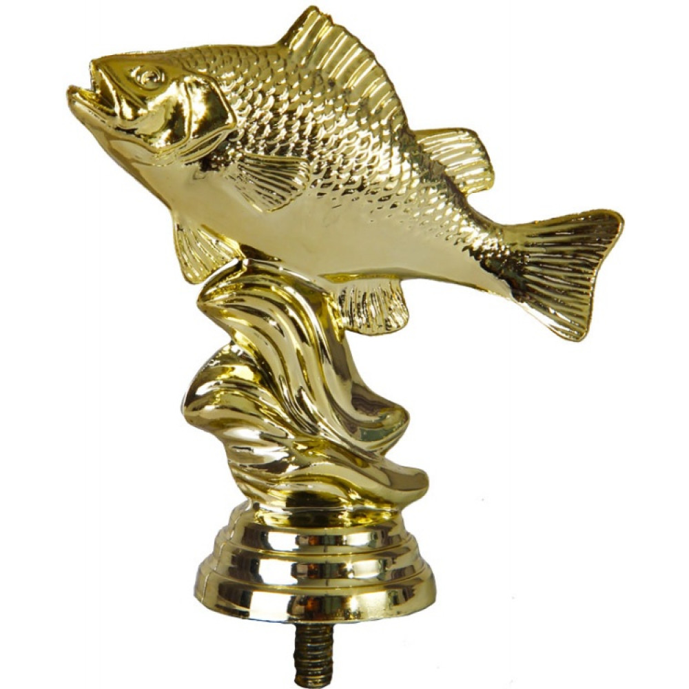 Цвет: золото, материал: пластик. Тема: рыболовство. Фигурка выполнена в виде рыбы, застывшей на волне. Ртом она хватает воздух, плавники неподвижны. Золотая чешуя переливается на свету. Рыба лежит брюхом на волне, которая покрыта объёмными волнистыми полосами. Ниже - круглое основание, на котором имеются горизонтальные линии. Высота, см: 8.9. Фигурку возможно закрепить на цоколь, постамент или кубок.