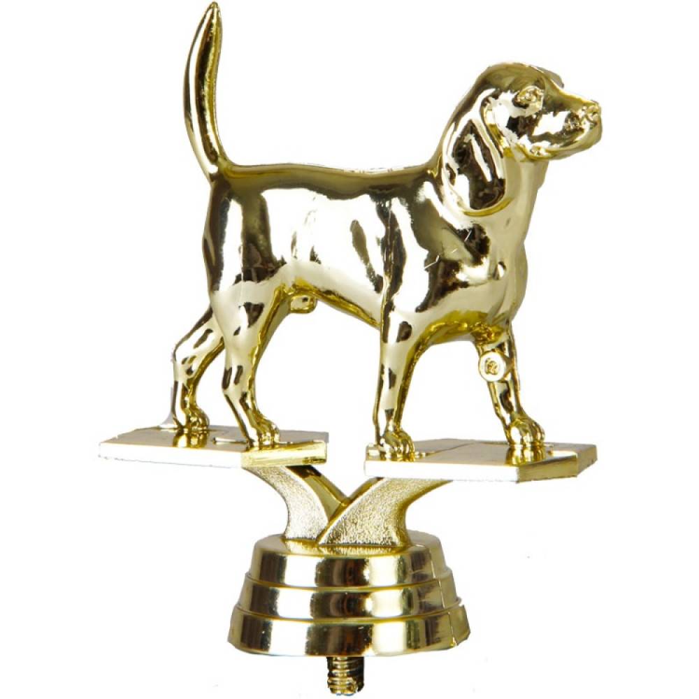Цвет: золото, материал: пластик. Тема: собаки. Фигурка выполнена в виде собаки, будто ожидающей приказа. Её хвост поднят вверх, кажется, что ещё секунду и собака начнёт вилять. Она приподняла голову, вслушиваясь в слова хозяина, длинные уши опущены вниз. У собаки короткие лапы и жилистое тело. Собака стоит на двух пластинах, соединенных вместе. Ниже - круглое основание, на котором имеются горизонтальные линии. Высота, см: 9.8. Фигурку возможно закрепить на цоколь, постамент или кубок.