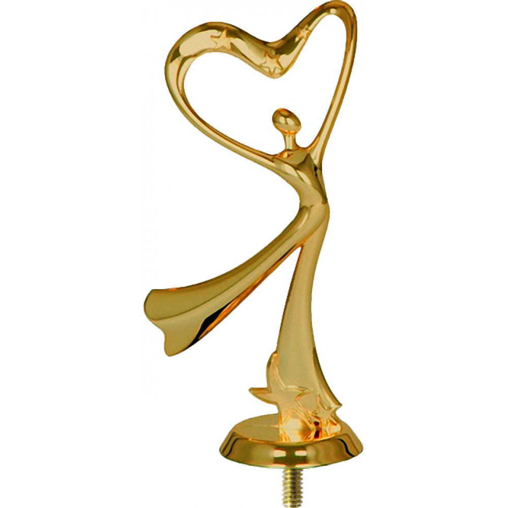 Фигурка пластиковая "Танец". Цвет золото, высота 16 см. Представляет собой силуэт женщины, которая танцует. Женщина стоит на левой ноге, правая нога отведена назад, женщина одета в широкие брюки, на левой ноге у основания брюки имеют узор в форме звезд. Руки женщины подняты вверх, соединены и представляют собой форму сердца. На сердце находятся три вдавленные звезды. Фигурка установлена на круглой плоской подставке. Фигурку возможно закрепить на цоколь, постамент или кубок.