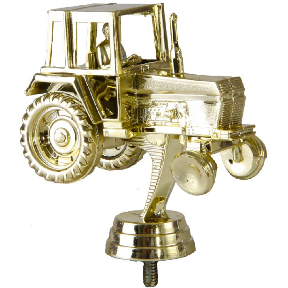 Цвет: золото, материал: пластик. Тема: трактор. Фигурка выполнена в виде трактора с сидящим в нём трактористом. Большие задние колёса покрыты бороздами. Тракторист крепко держится за руль. Передние колёса намного меньше тех, что сзади. Труба трактора поднята вверх. Кажется, что еще немного и трактор поедет, оставляя на дорогах широкие борозды. Спереди трактора выполнены узкие линии, похожие на тонкую решётку. Трактор приподнят воздухе, что позволяет детально рассмотреть фигурку. Ниже - круглое основание, на котором имеются горизонтальные линии. Высота, см: 10.2. Фигурку возможно закрепить на цоколь, постамент или кубок.