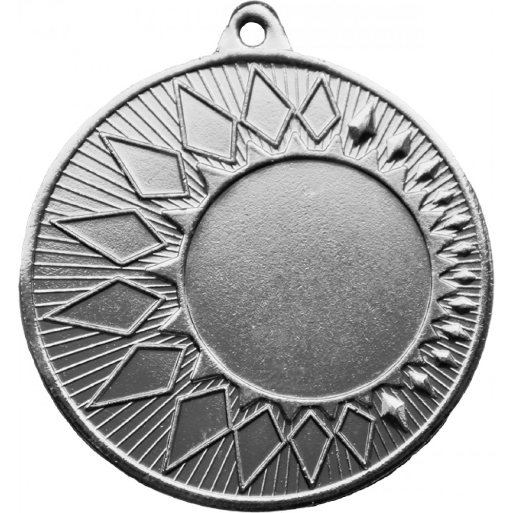 Медаль круглая металлическая. Диаметр 50 мм, толщина 3 мм.¶Цвет медали, имитирующий золото/серебро/бронзу.¶Сверху расположено круглое ушко для крепления ленты. ¶В центре аверса расположено место под вкладку, смещенное в правую сторону, диаметр 25 мм. Имеет кант в виде треугольных коротких стилизованных лучей. Между лучей в стороны отходят неравносторонние ромбы, в виде драгоценных камней, так же от места под вкладку отходят тонкие выпуклые полосы. Медаль имеет кант.¶На медали нет никаких других изображений, нет рисунков, относящихся к конкретному виду спорта.