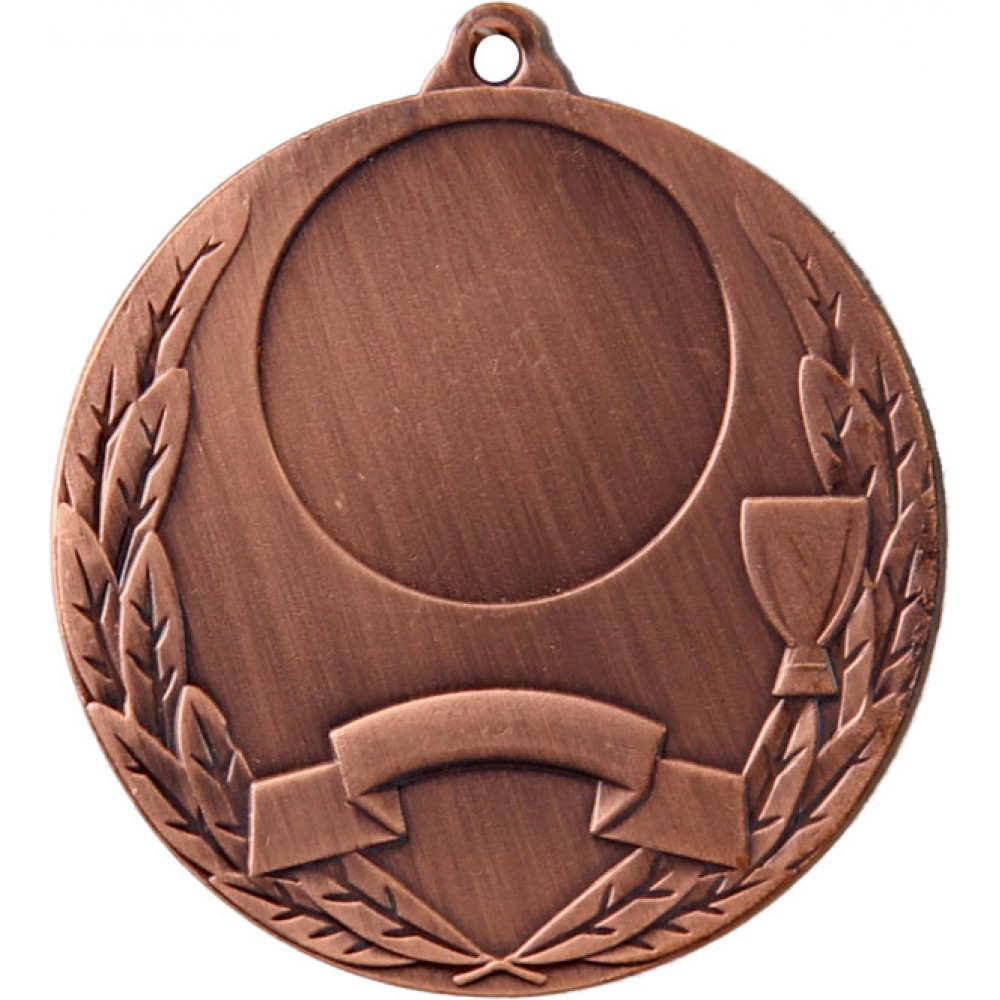 Медаль металлическая, круглой формы. Диаметр 50 мм, толщина 3 мм.¶Цвет медали, имитирующий золото/серебро/бронзу.¶Сверху расположено округлое ушко для крепления ленты.¶В центральной верхней части лицевой стороны медали расположено место под вкладку, диаметр 25 мм. Снизу медали отходят широкие лавровые ветви и огибают диаметр. С правой стороны на лавровой ветки изображен небольшой выпуклый кубок. У основания ветвей растянута лента.¶На медали нет никаких других изображений, нет рисунков, относящихся к конкретному виду спорта.