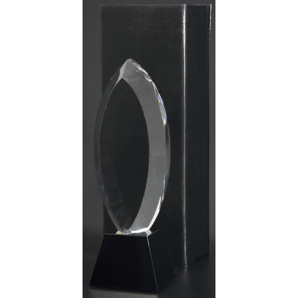Награда хрустальная, прозрачная. Высота 30 см. Толщина фигуры 40 мм. В комплекте футляр из бумвинила. Фигура представляет собой эелемент в форме овала с заостренной верхней и нижней стороной, фигура напоминает "лист". Фигура установлена на подставку в форме усеченной пирамиды, материал - пластик, цвет- черный.