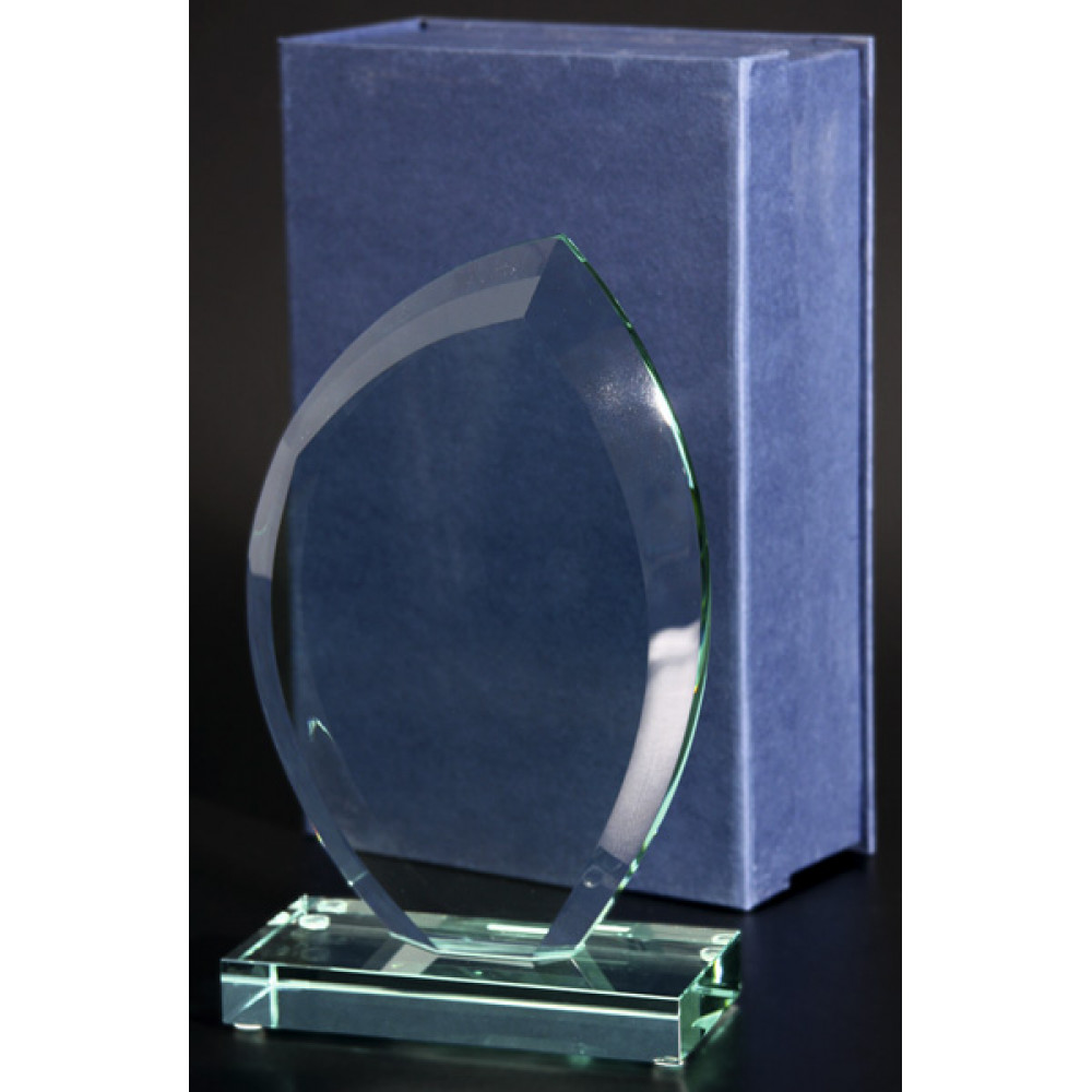 Награда стеклянная, прозрачная. Толщина стекла 18 мм. В комплекте футляр из бумвинила. Награда в форме "листочка", или "огонька", установленная на невысокий параллелепипед. Края фигуры срезаны под углом.