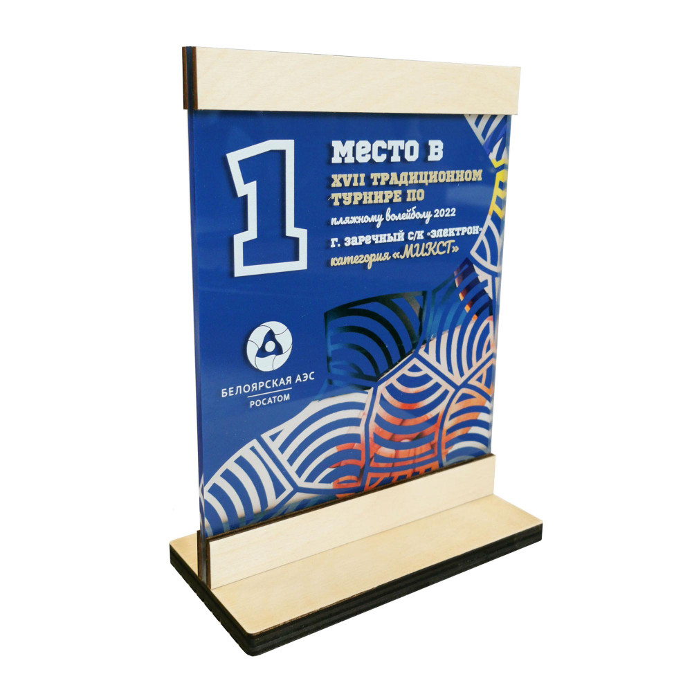 Приз из дерева (3-слойный) с акрилом и пластиком, с УФ-печатью