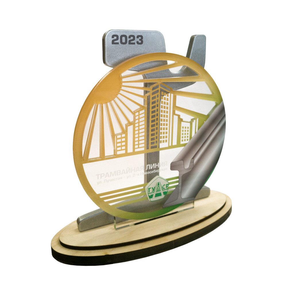 Каждый приз состоит из трех слоев: металла, акрила и дерева. Такая слоистая структура придает изделию глубину и выразительность. Металлический слой создает основу, акриловый слой добавляет прозрачность и игру света, а деревянный слой придает теплоту и оригинальность.