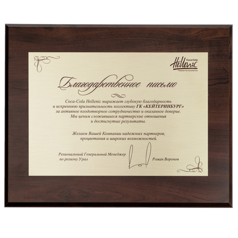 Основание плакетки выполнено из МДФ с покрытием под дерево или камень различных цветов. Металлическая пластина выполнена из алюминия, цвета золото или серебро по желанию заказчика. Изображение на пластину нанесено методом сублимации. Небольшой нюанс данной технологии: цвета нанесения могут незначительно искажаться за счёт цвета самой пластины. Пластина с нанесенным на неё изображением крепится к основанию с помощью специального двухстороннего скотча.