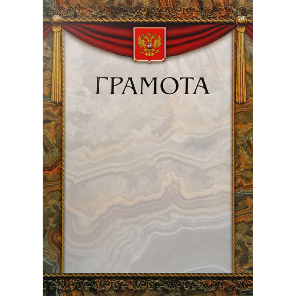 Грамота с тиснением, формат А4. Бумага матовая, толщина 200 гр, полноцветная печать. ¶Фон грамоты цветом натурального камня, с оранжевыми и изумрудными переливами. По центру прозрачный фон. В верхней части написано слово "Грамота" черным цветом. Над словом "свисает" красная ткань, с двух сторон закреплена "кисточками". По центру ткани изображен российский герб. Сверху и снизу грамоты изображены полосы с узором.