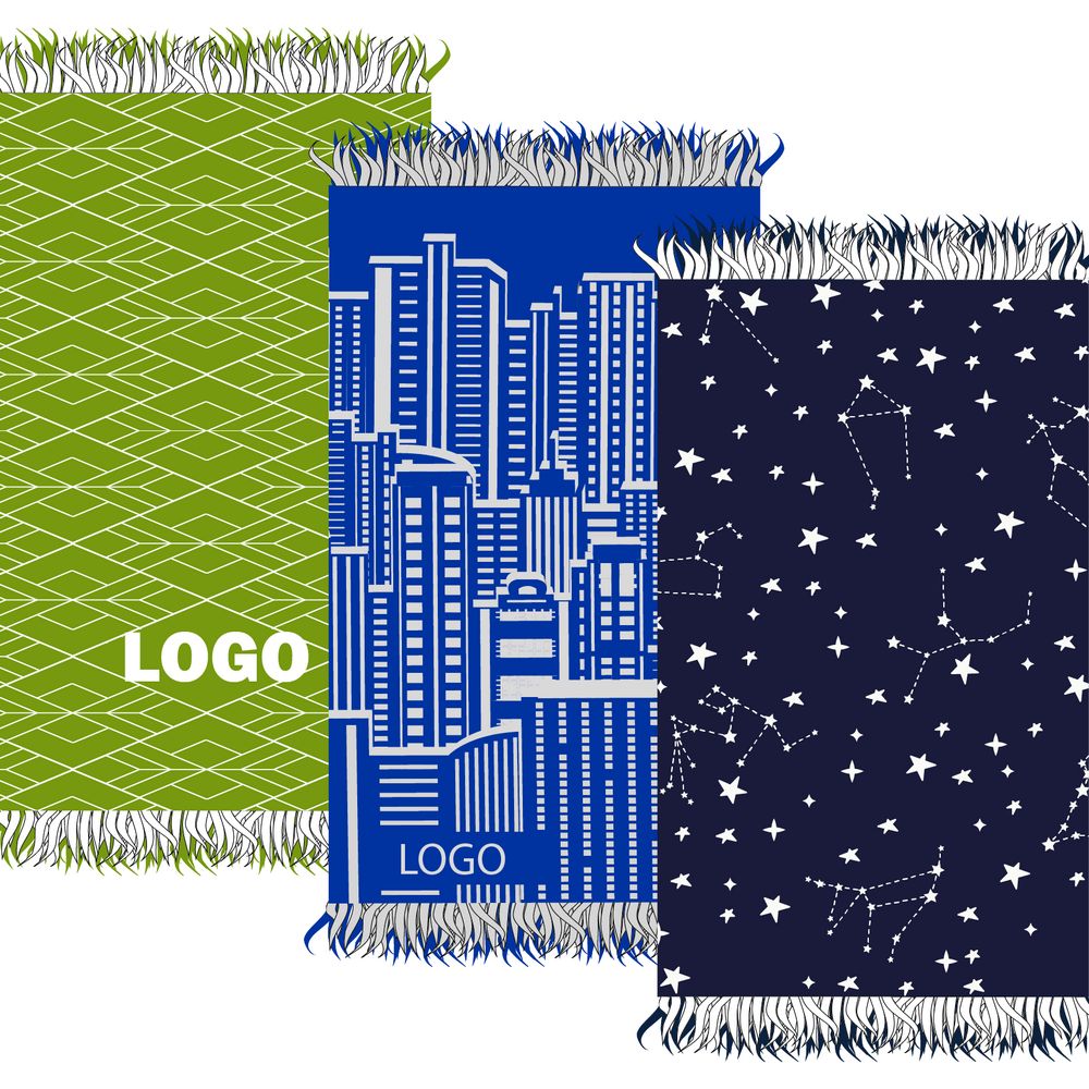 Плед с вывязанным логотипом и индивидуальным рисунком в фирменной цветовой гамме.