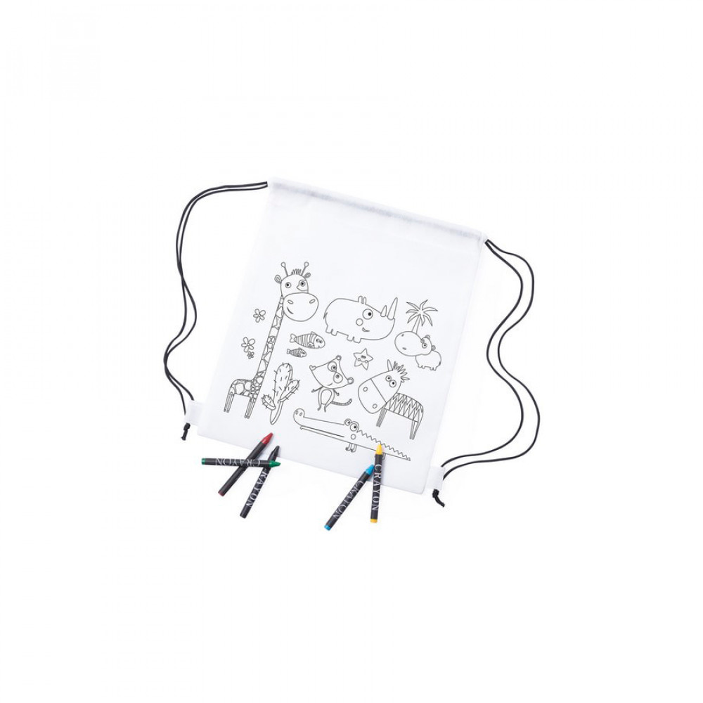 Рюкзак из нетканого материала белого цвета, специально созданный для раскрашивания мелками. В набор входят 5 цветных мелков: синий, красный, зеленый, желтый, черный.