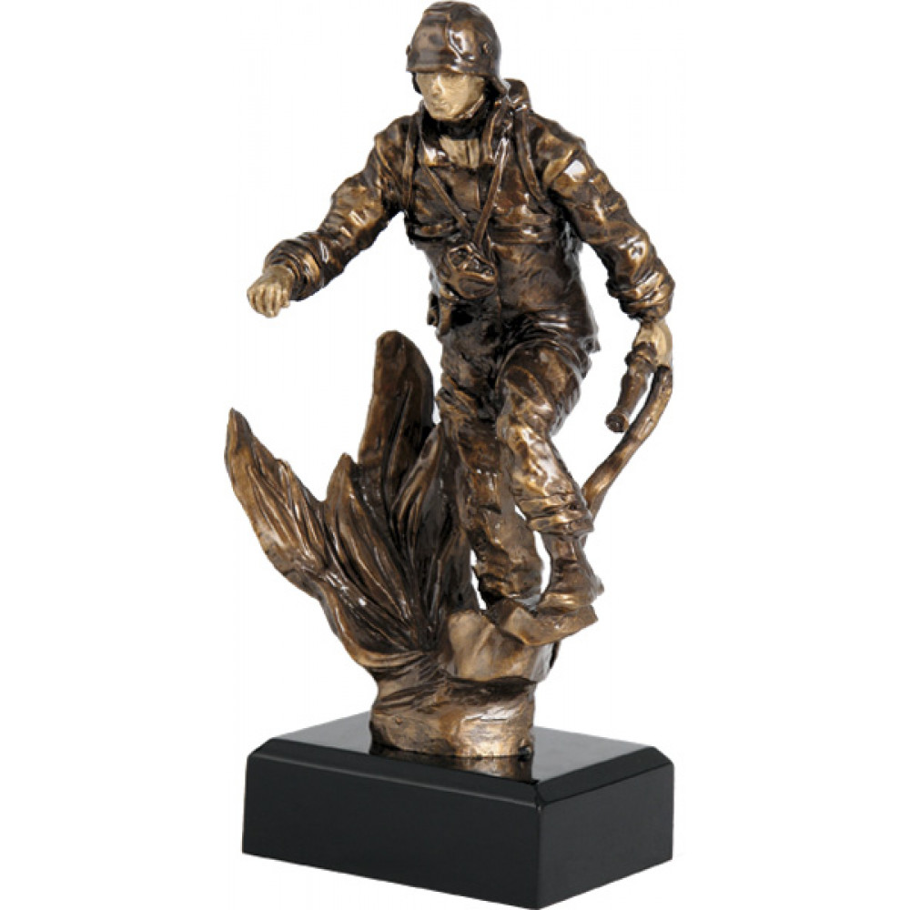 Фигурка литая "Пожарный". Цвет бронза. Материал: пластик. Высота 17,5; 26 см. Изображен пожарный, идущий сквозь огонь, в левой руке держит шланг для тушения. Фигурка установлена на цоколе в форме прямоугольника, цвет черный.