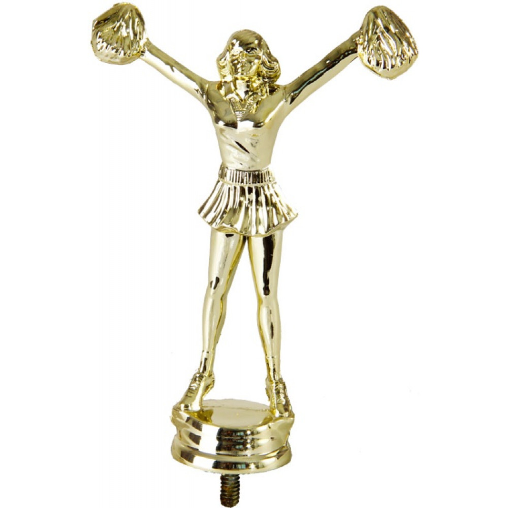 Цвет: золото, материал: пластик. Вид спорта: черлидинг. Фигурка выполнена в виде девушки-черлидерши. Ее руки расставлены в сторону и приподняты вверх. В них зажаты помпоны. Девушка одета в футболку и короткую юбку. На ногах- кроссовки. Высота, см: 14см. Фигурку можно закрепить на цоколь, постамент или кубок.