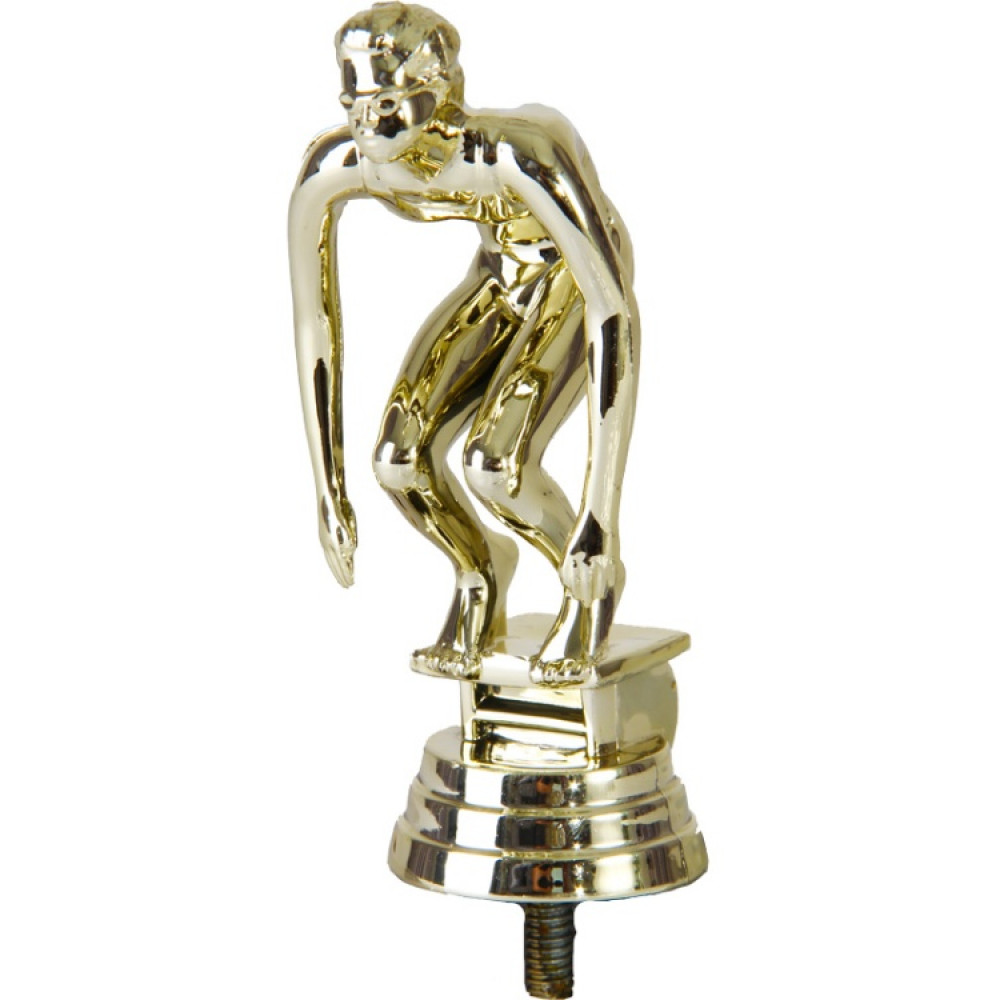 Цвет: золото, материал: пластик. Вид спорта: плавание. Фигурка выполнена в виде женщины-пловца. Спортсменка готовится к прыжку: её ноги согнуты в коленях, пятки оторваны от земли, руки расслаблено свисают вниз. Кажется, ещё секунда и спортсменка прыгнет вводу. Взгляд направлен прямо, голова поднята. На лице надеты защитные очки, на голое шапка для плавания. Женщина находится на краю мостика для прыжков. Ниже - круглое основание, на котором имеются горизонтальные линии. Высота, см: 11.4 Вес, кг: 0.042. Фигурку возможно закрепить на цоколь, постамент или кубок.