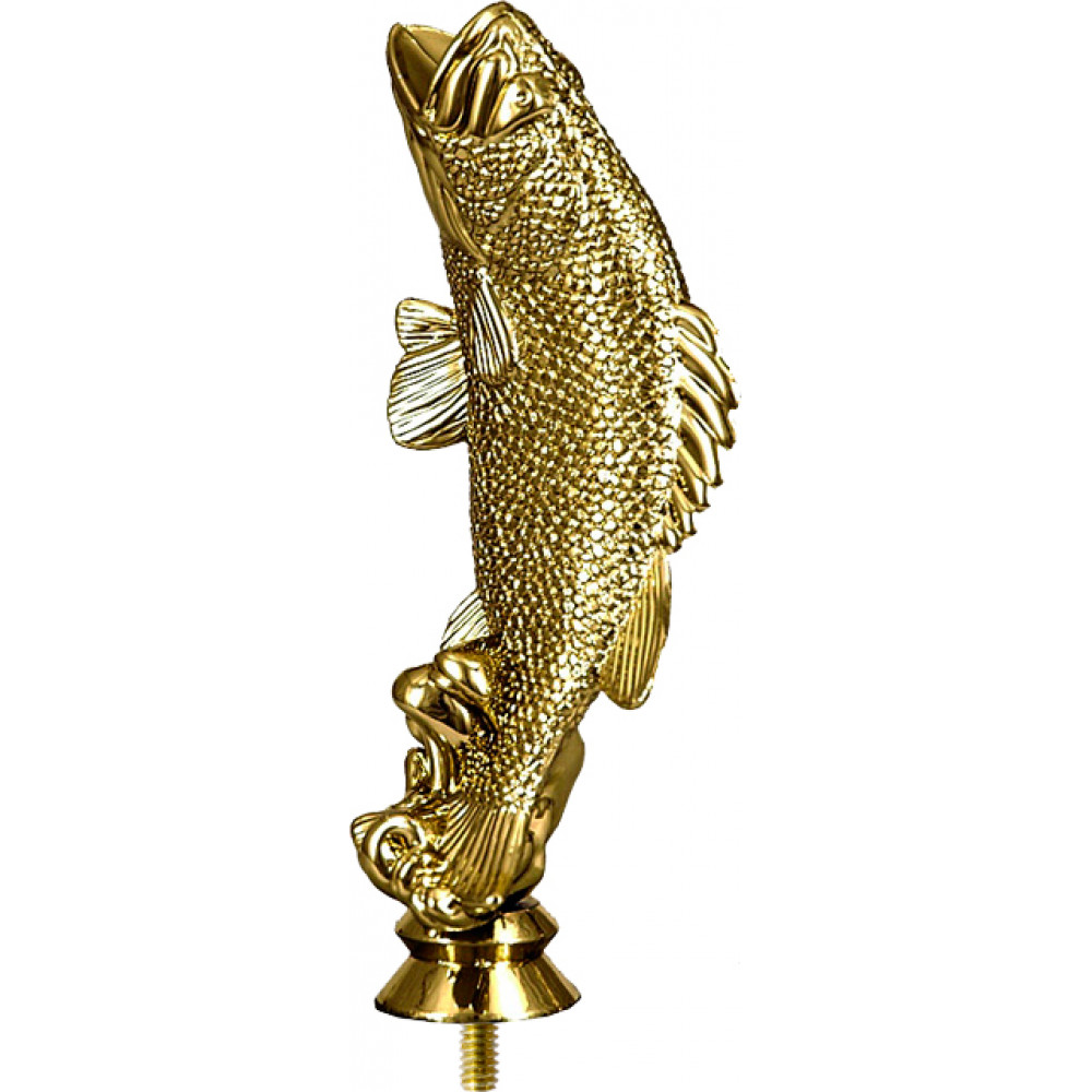 Фигурка пластиковая "Рыба". Цвет золото. Высота 15 см. Изображена рыба, расположенная вертикально, у рыбы широко открыт рот. Хвост рыбы касается волн. Фигурка установлена на стеме в виде небольшого элемента конусообразной формы. Фигурку возможно закрепить на цоколь, постамент или кубок.