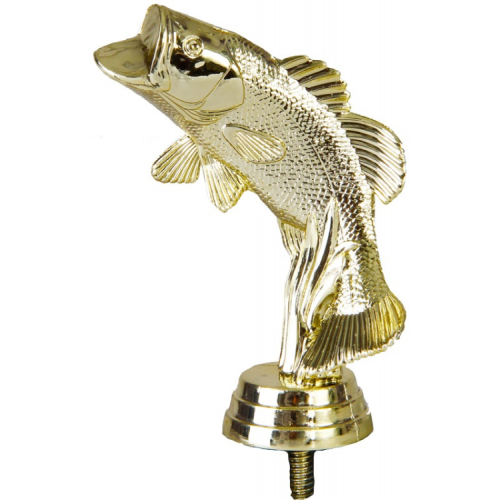 Цвет: золото, материал: пластик.Тема: рыболовство. Фигурка выполнена в виде рыбы, извивающейся в воздухе. Широко открытым ртом она хватает воздух, передние плавники застыли в движении. Её тело согнуто по дуге, кончик хвоста приподнят. На плавниках выполнен рисунок в виде тонких объёмных полос. Тело покрыто мелкой чешуёй. Ниже - круглое основание, на котором имеются горизонтальные линии Высота, см: 10.2. Фигурку возможно закрепить на цоколь, постамент или кубок.