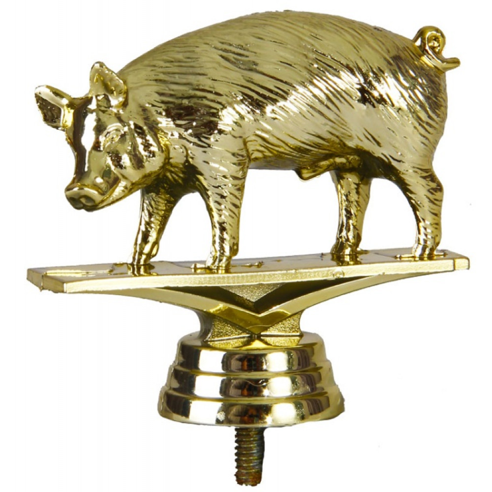 Цвет: золото, материал: пластик. Тема: свинья. Фигурка выполнена в виде большой свиньи. Её хвост завёрнут в маленькую спиральку. Свинья нагибается к земле, маленькие уши подняты над головой. Пятачок низко опущен, словно свинья принюхивается. Тело свиньи покрыто мелким узором в виде тонких линий. Свинья находится на тонкой прямоугольной пластине, которая служит имитацией земли. Ниже - круглое основание, на котором имеются горизонтальные линии. Высота, см: 7.9. Фигурку возможно закрепить на цоколь, постамент или кубок.