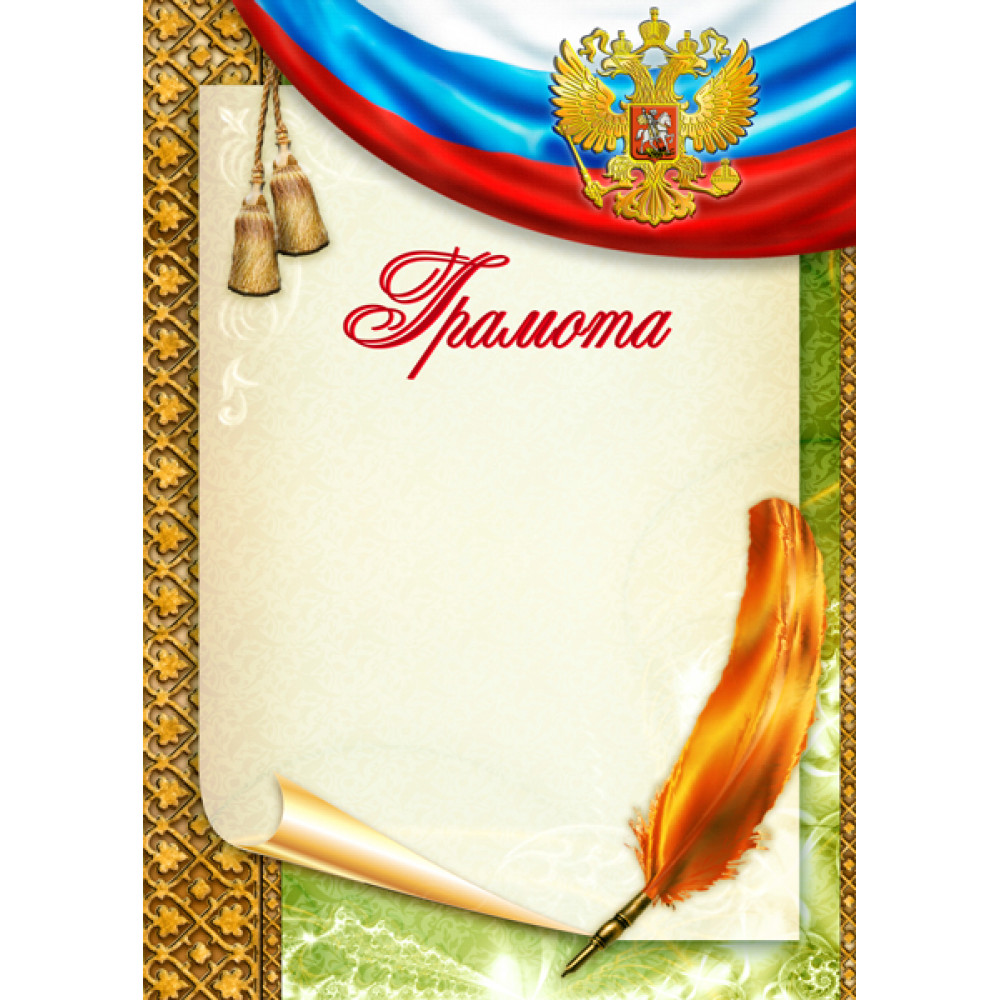 Грамота, формат А4. Бумага матовая, толщина 200 гр, полноцветная печать. ¶На грамоте изображен орнамент в виде золотой металлической решетки с узорами. Узор огибает зеленый расписной фон. Поверх данных узоров расположен бежевый фон в виде листа, будто у него отогнут край, в правом нижнем углу расположено бронзово-золотое перо для письма. В верхней части бежевого фона расположено слово: Грамота, шрифт с наклоном. В правом верхнем углу изображен российский флаг в виде натянутой ткани. На флаге изображен российский герб, от ткани свисают "кисточки".
