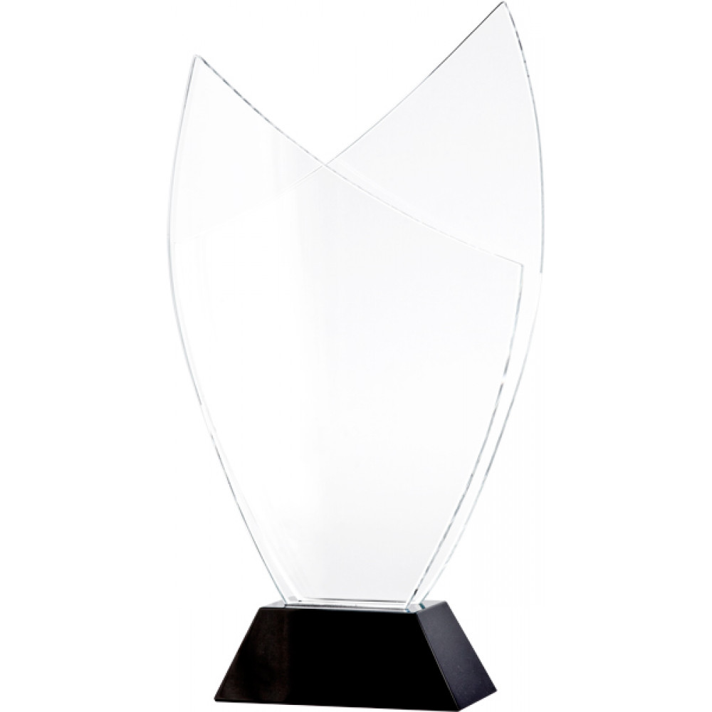 Награда хрустальная. Прозрачная. Высота фигуры 38 см. В комплекте футляр из бумвинила. Фигура в форме овала, с усеченной верхней частью в форме треугольника. Фигура установлена на подставку в форме усеченной пирамиды, материал - пластик, цвет- черный.