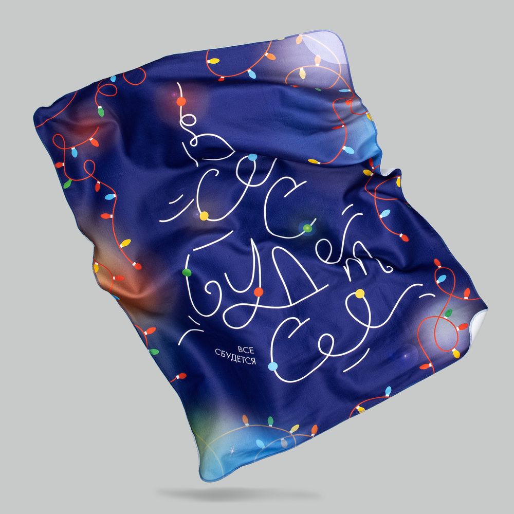 Праздничный плед-пожелание: лаконичное и воодушевляющее. Все сбудется! Стоит только загадать самое главное и стремиться к своей заветной мечте. А Вселенная подскажет, обнимет и согреет — прямо как этот красочный мягкий плед, словно по-настоящему мерцающий яркими огоньками.