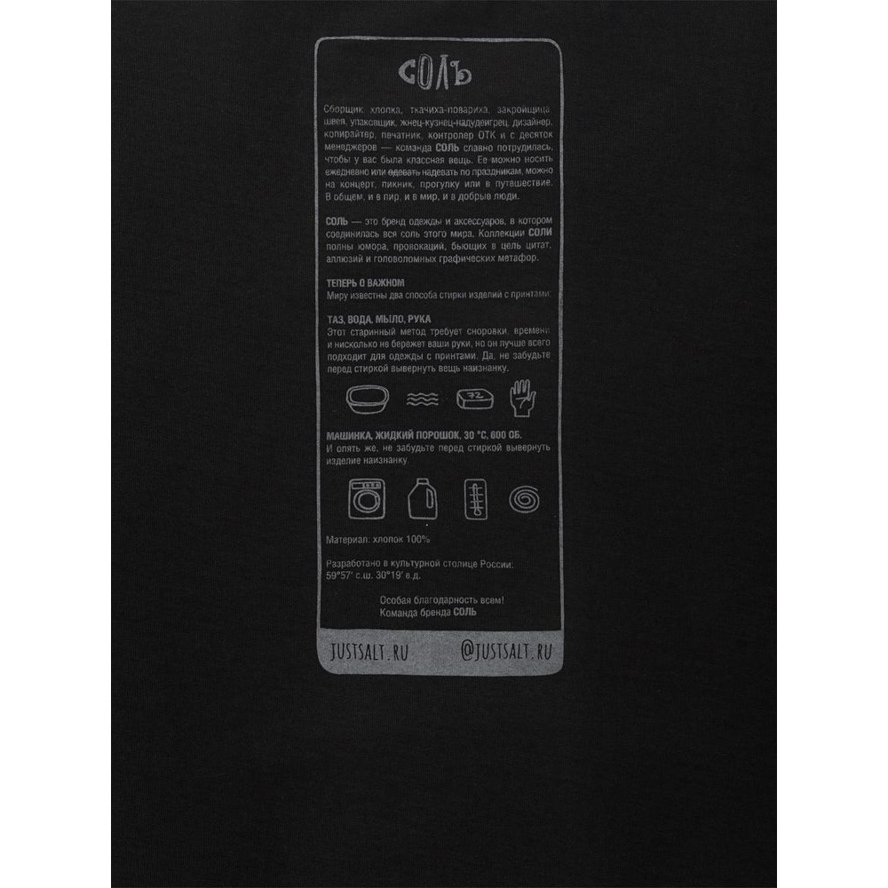 Принт с информацией о бренде и инструкцией по уходу за изделием на изнаночной стороне футболки.