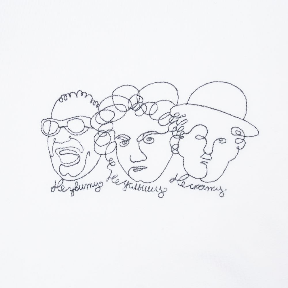 «Ничего не вижу, ничего не слышу, ничего никому не скажу». Аллюзия на культурный феномен представлена вышивкой с портретами трех великих авторов. Музыкант Рей Чарльз был лишен зрения, композитор Людвиг Ван Бетховен — слуха, а актер и режиссер Чарли Чаплин создавал немое кино. Никакие ограничения не могут помешать талантливому человеку доносить свои идеи и создавать прекрасное.Классический кроеный свитшот унисекс. Манжеты, ворот и низ изделия отделаны резинкой. Внутренняя сторона без начеса.