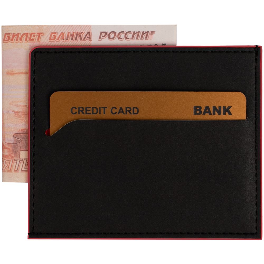 Чехол выполнен из материала Soft Touch Pearl, черный АА, дополнен окрашенным срезом края и внутренним карманом из цветного картона. Имеет 4 отделения для кредитных карт и 1 отделение для купюр.