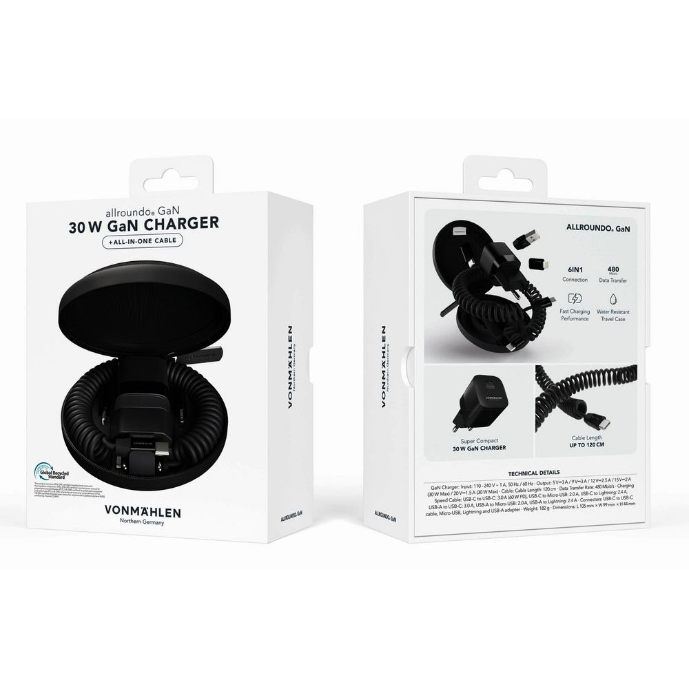 Vonmаhlen Allroundo GaN — это компактный и удобный в использовании аксессуар, сочетающий в себе зарядное устройство мощностью 30 Вт и многофункциональный кабель с переходниками для удобной зарядки самых разных устройств. Комплект переходников позволяет создать до 6 разных конфигураций зарядного кабеля, что делает его по-настоящему универсальным.