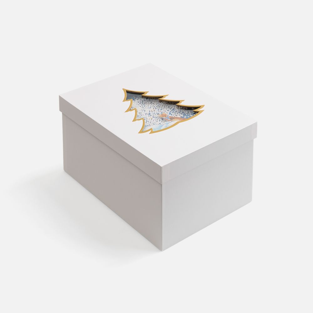 Белоснежная коробка из переплетного картона с окошком в форме ели, которое приглашают в мир зимних чудес. Внутри ждет очаровательная лисичка в пушистом снегу. 3D-иллюстрация наполняет пространство теплом и радостным предвкушением чуда, а подвижные шарики из пенопласта вызывают по-настоящему детский восторг.